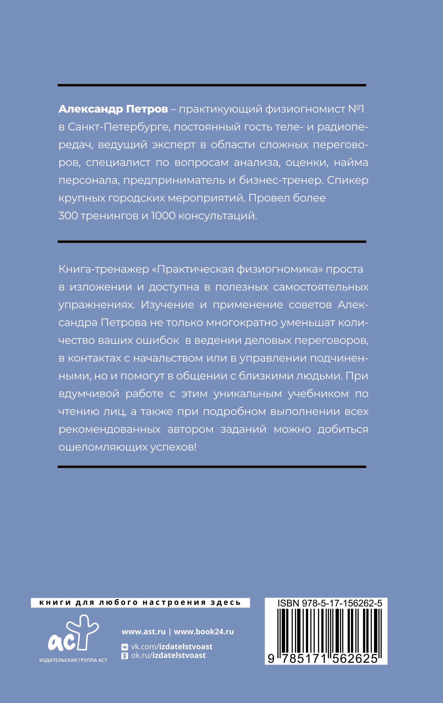 Александр Петров - практикующий физиогномист №1 в Санкт-Петербурге, постоянный гость теле- и радиопередач, ведущий эксперт в области сложных переговоров, специалист по вопросам анализа, оценки, найма персонала, предприниматель и бизнес-тренер. Спикер крупных городских мероприятий. Провел более 300 тренингов и 1000 консультаций. Книга-тренажер "Практическая физиогномика" проста в изложении и доступна в полезных самостоятельных упражнениях. Изучение и применение советов Александра Петрова многократно уменьшит количество ваших ошибок не только в ведении деловых переговоров, в контактах с начальством или в управлении подчиненными, но и поможет в общении с близкими людьми. При вдумчивой работе с этим уникальным учебником по чтению лиц, а так же при подробном выполнении всех рекомендованных автором заданий, можно добиться ошеломляющих успехов!| Издательство | ИЗДАТЕЛЬСТВО "АСТ" |
