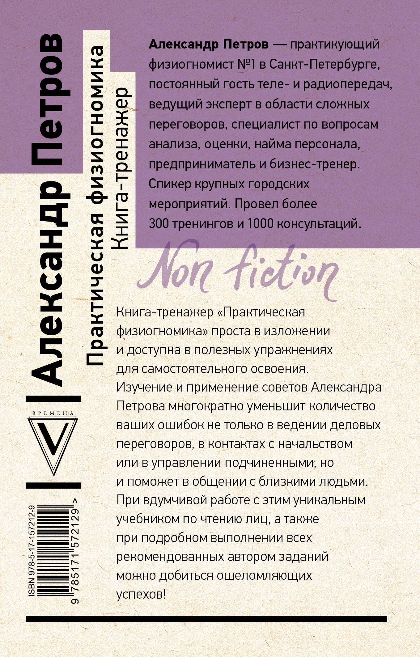 Александр Петров - практикующий физиогномист №1 в Санкт-Петербурге, постоянный гость теле- и радиопередач, ведущий эксперт в области сложных переговоров, специалист по вопросам анализа, оценки, найма персонала, предприниматель и бизнес-тренер. Спикер крупных городских мероприятий. Провел более 300 тренингов и 1000 консультаций. Книга-тренажер "Практическая физиогномика" проста в изложении и доступна в полезных упражнениях для самостоятельного освоения. Изучение и применение советов Александра Петрова многократно уменьшит количество ваших ошибок не только в ведении деловых переговоров, в контактах с начальством или в управлении подчиненными, но и поможет в общении с близкими людьми. При вдумчивой работе с этим уникальным учебником по чтению лиц, а также при подробном выполнении всех рекомендованных автором заданий, можно добиться ошеломляющих успехов!| Издательство | ИЗДАТЕЛЬСТВО "АСТ" |