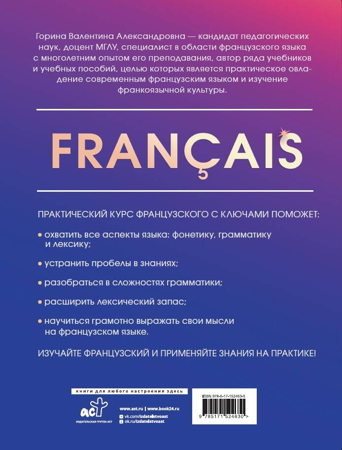 Горина Валентина Александровна - кандидат педагогических наук, доцент МГЛУ, специалист в области французского языка с многолетним опытом его преподавания, автор ряда учебников и учебных пособий, целью которых является практическое овладение современным французским языком и изучение франкоязычной культуры. В этом издании представлен практический курс французского, который охватывает лексический, грамматический и фонетический разделы языка. В книге представлен подробный разбор букв и звуков, правил чтения и произношения слов. Вы найдете аутентичные тексты для чтения. Такие тексты способствуют не только развитию навыков чтения, но и помогают улучшить письменную и устную речь. Изучение грамматики начинается с самых простых тем и усложняется от урока к уроку. Все правила находят отражение как в текстах, так и в упражнениях. В самоучителе представлено большое количество упражнений, чтобы применить теоретический материал на практике. В конце книги вы найдете ключи к упражнениям. Издание предназначено для всех желающих изучать французский язык. Это пособие станет надежным помощником в прохождении обучения от начального уровня до уровня B2 и обеспечит эффективное усвоение изучаемого материала как под руководством преподавателя, так и в формате самостоятельной работы.
