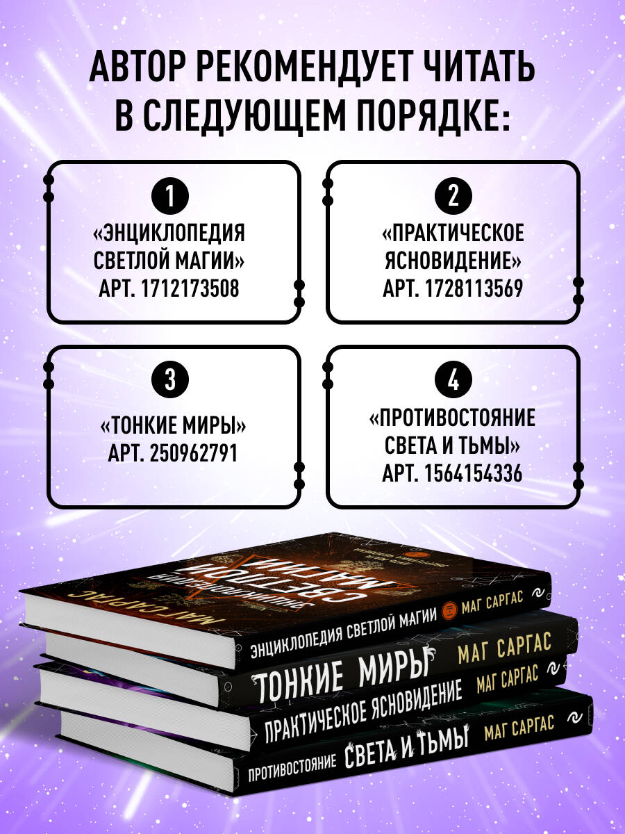 Новая книга Мага Саргаса посвящена развитию ясновидения Помимо теории, автор предлагает ряд практических упражнений. Следуя наставлениям Мага Саргаса и выполняя домашние задания, вы научитесь видеть ауру, различать ее цвета и интерпретировать получаемую информацию. Вы сможете распознавать чужое негативное влияние, защищаться от него и исправлять последствия вредоносного воздействия. «Магия, на мой взгляд - это искусство изменения. Магом себя может считать только тот, кто направляет силы не только внутрь себя (на самопознание и духовный рост), но и во внешний мир, меняя его в соответствии со своими желаниями, целями и принципами» Маг Саргас| Издательство | ООО "Издательство "Эксмо" |