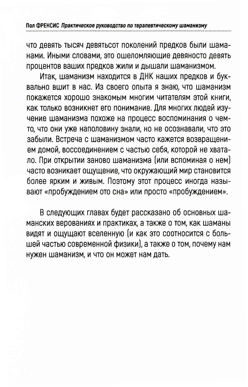 Пол Фрэнсис - антрополог (изучал шаманские культуры Непала, Африки, Новой Гвинеи, Полинезии, Центральной Америки и др. культур), психотерапевт, практикующий шаман, организатор колледжа «Три ворона» (Уэльс), обучающего специалистов по терапевтическому шаманизму. В книге описаны основные принципы шаманизма и его философия, приводится много практик, которые могут быть использованы для совершения шаманских путешествий. Много внимания уделено адаптации фундаментальных принципов шаманизма к современной жизни. Для всех интересующихся шаманизмом и его применением в наше время.| Издательство | Изд.Базенков И.Л. |