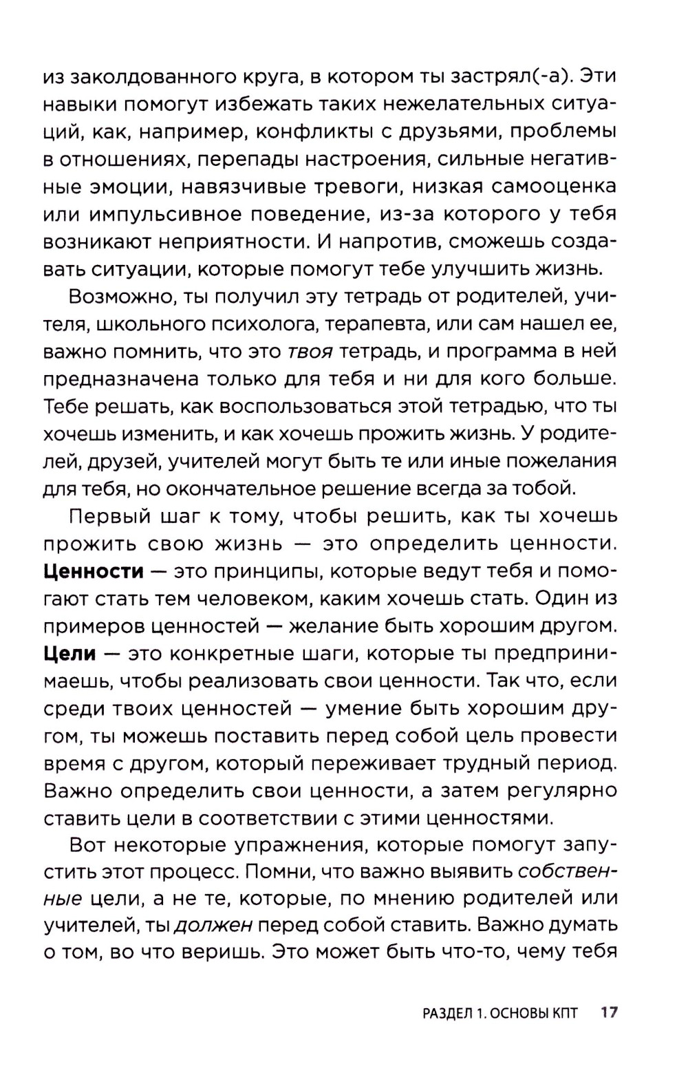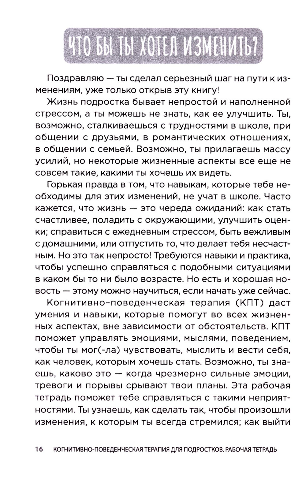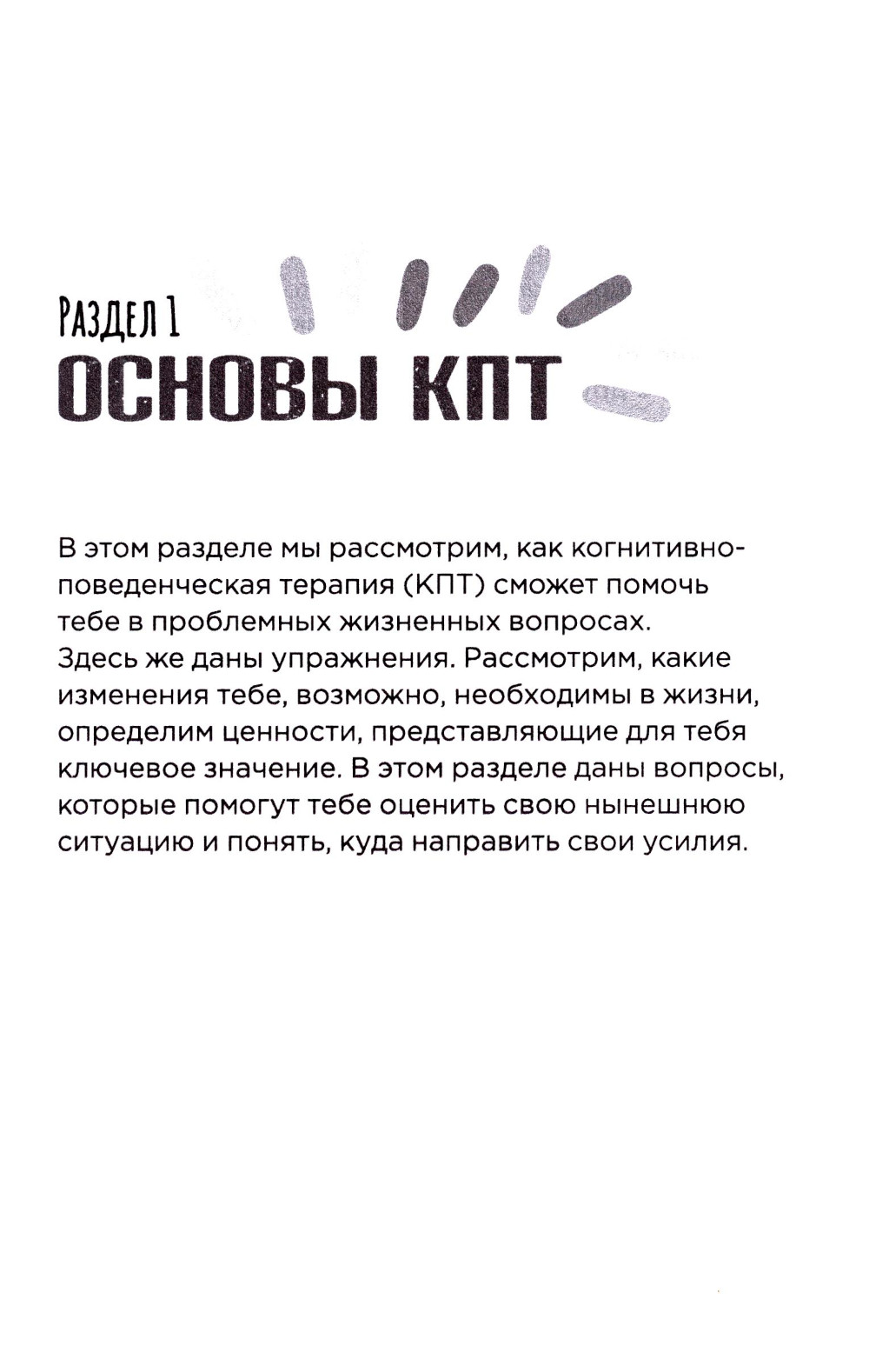Комплект содержит книги. «Практика когнитивно-поведенческой терапии» Рабочие листы и раздаточные материалы по когнитивно-поведенческой терапии для практикующих психотерапевтов и клиентов. Сборник практических материалов по всем направлениям КПТ. Все рабочие листы сопровождаются объяснениями и примерами заполнения. • Дневники; • Когнитивные модели; • Упражнения; • Листы для оспаривания, экспозиции и др.; • Поведенческие эксперименты. «Когнитивно-поведенческая терапия для подростков» Иногда ты страдаешь от тяжелых мыслей или испытываешь тяжелые чувства. Если бы ты мог стряхнуть этот груз, кем бы ты был и что бы делал? Стал бы лучше для своих друзей? Привел бы свою спортивную команду к победе? Улучшил бы успеваемость? С этой рабочей тетрадью ты обучишься стратегиям, помогающим жить жизнью, к которой ты стремишься, применяя КПТ. Эта книга поможет распутать клубок негативных мыслей, эмоций и поведения, которые вызывают у тебя тревогу, грусть или мешают делать то, что ты хочешь. Упражнения, которые выполняются в интерактивном режиме, станут твоим помощником в решении непростых задач, возникающих при общении с домашними, в школе или на работе, а также с друзьями; а книга - станет средством, помогающим преодолеть жизненные трудности.