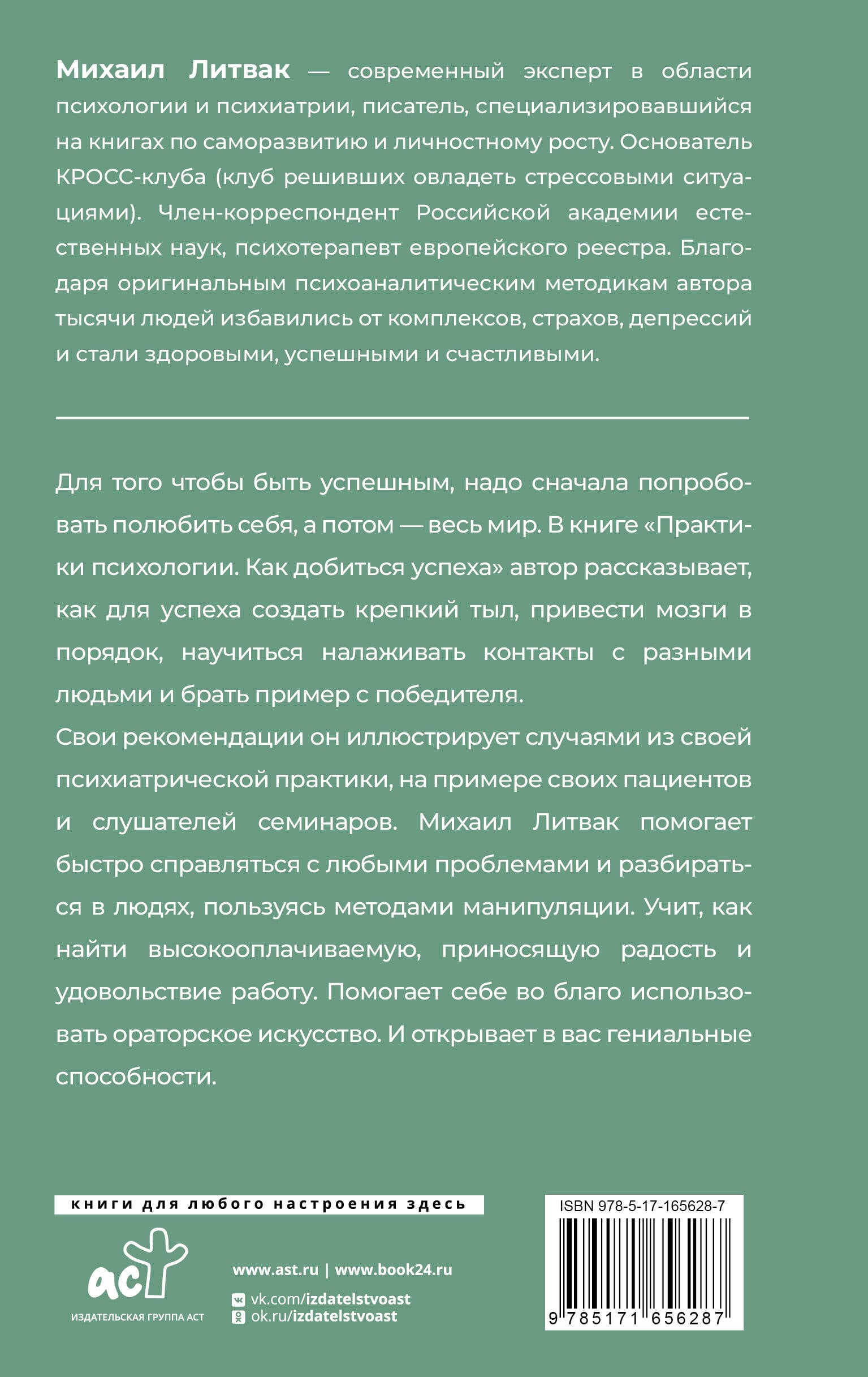 Михаил Литвак - ведущий психотерапевт международного реестра, автор книг, изданных тиражом 15 000 000 экземпляров. Он вывел правила психологии и логики, которые помогают быстро справляться со всеми проблемами, пользуясь особыми методами манипуляции. Для того чтобы быть успешным, надо сначала попробовать полюбить себя, а потом - весь мир. В книге "Практики психологии. Как добиться успеха" автор рассказывает, как для успеха создать крепкий тыл, привести мозги в порядок, научиться налаживать контакты с разными людьми и брать пример с победителя. Свои рекомендации он иллюстрирует случаями из своей психиатрической практики, на примере своих пациентов и слушателей семинаров. Михаил Литвак помогает быстро справляться с любыми проблемами и разбираться в людях, пользуясь методами манипуляции. Учит, как найти высокооплачиваемую, приносящую радость и удовольствие работу. Помогает себе во благо использовать ораторское искусство. И открывает в вас гениальные способности.| Издательство | Издательство "АСТ" |