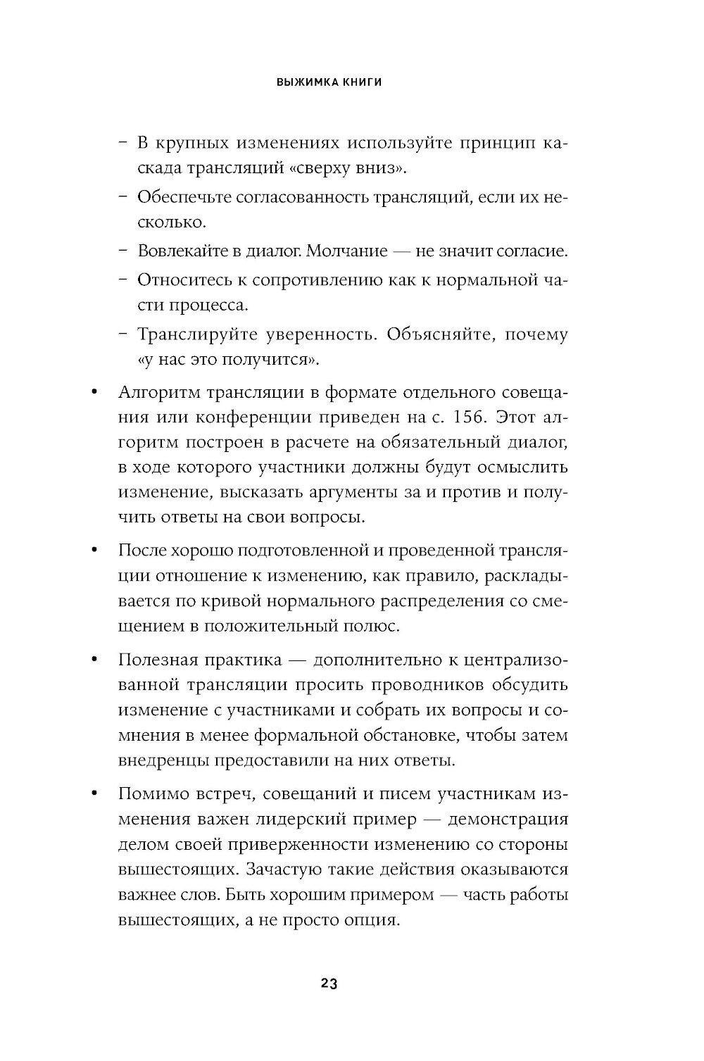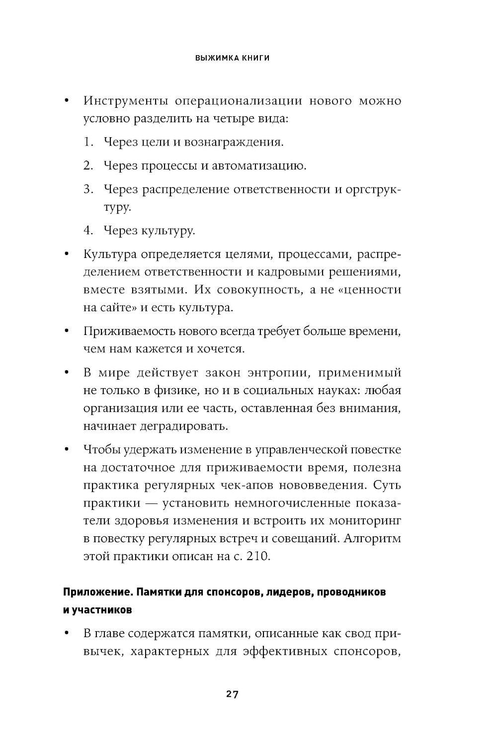 О том, как внедрять изменения. Организации совершенствуют свою структуру и стратегию, трансформируют культуру, улучшают бизнес-процессы и внедряют цифровые технологии. Значительная доля этих изменений заканчивается неудачей или достигает успеха лишь частично. Главная причина в том, что люди и организации не любят меняться. И наш мозг, и компании с их структурой и процессами «спроектированы» прежде всего для поддержания стабильности. Именно поэтому внедрение изменений требует других практик, чем управление операционной деятельностью. Такие практики описаны в этой книге, и вы сможете их освоить. Книга адресована первым лицам, которые хотят более эффективно управлять изменениями в своей организации, а также руководителям любого уровня, внедряющим изменения. Каждая из практик описана в виде четкого алгоритма и набора принципов и сопровождается примерами из жизни.| Издательство | Альпина Паблишер |