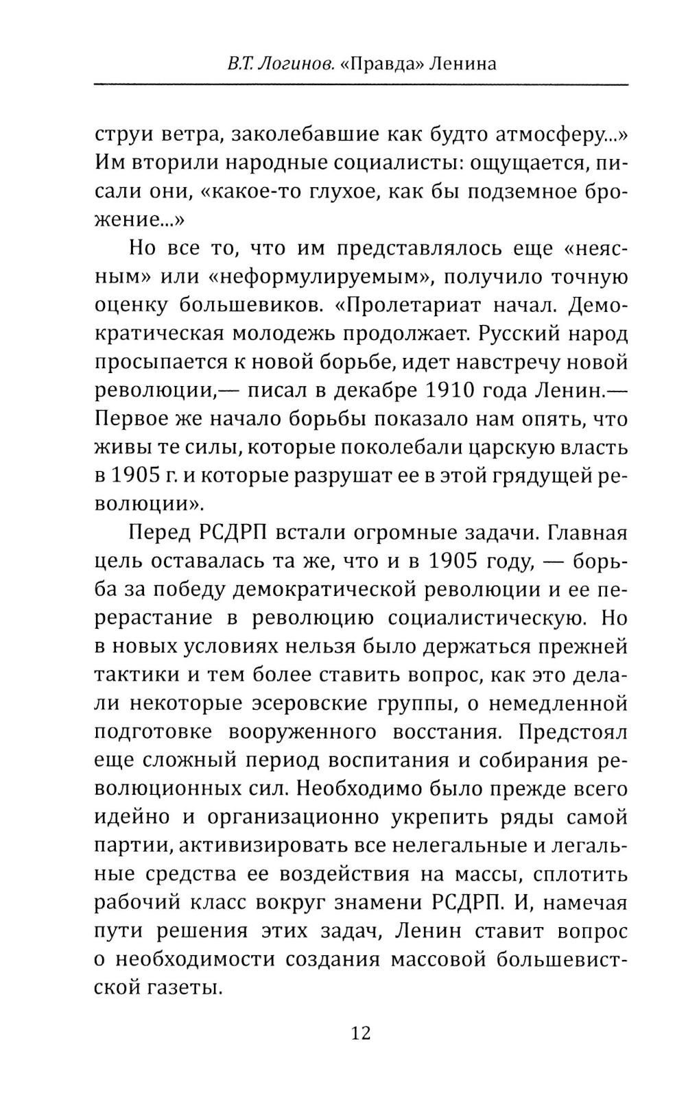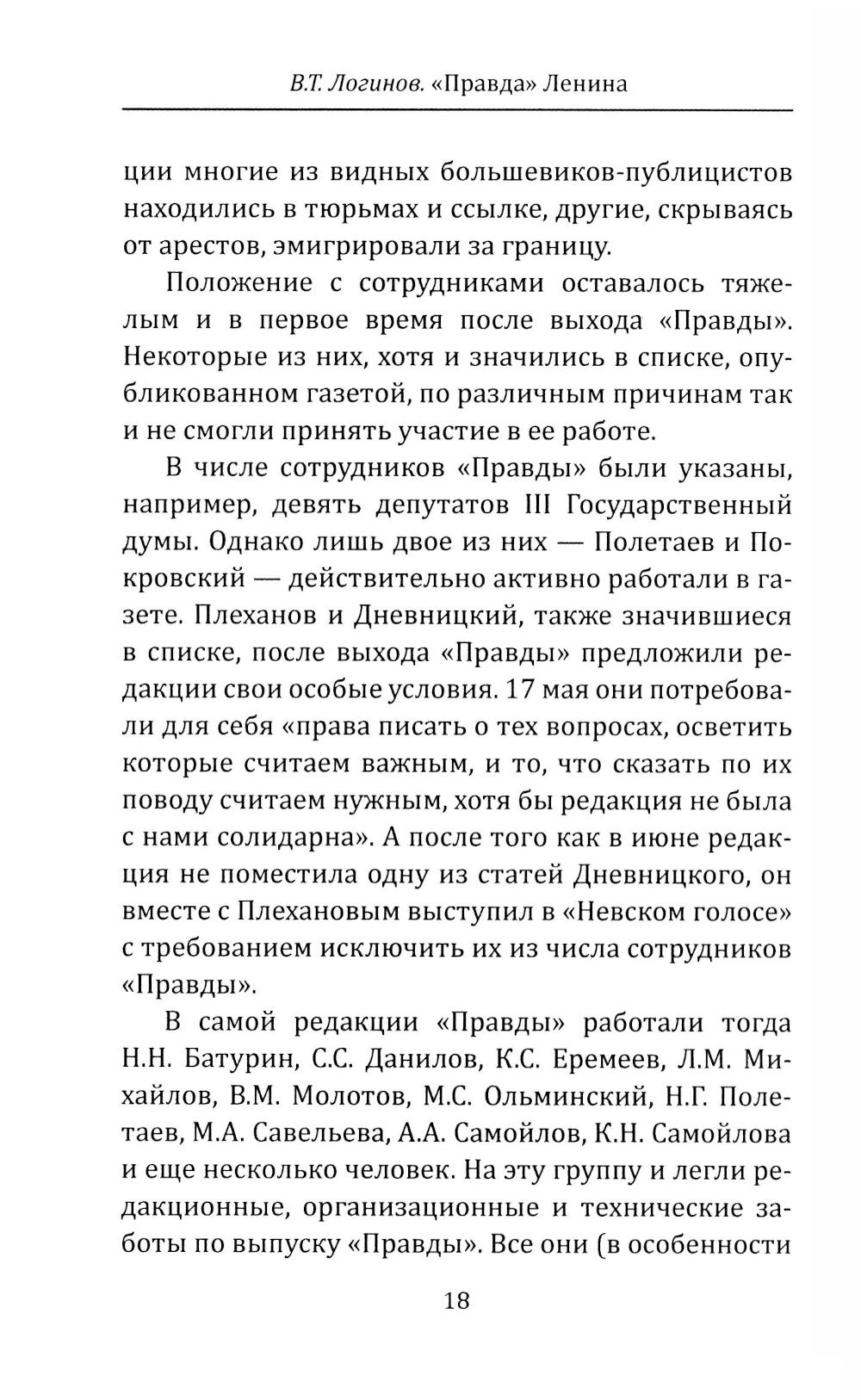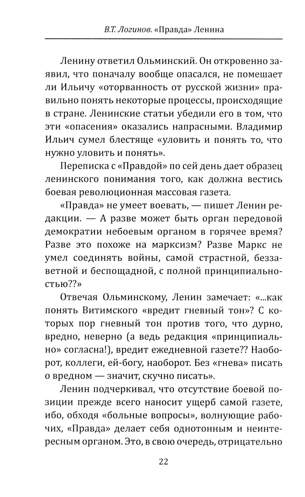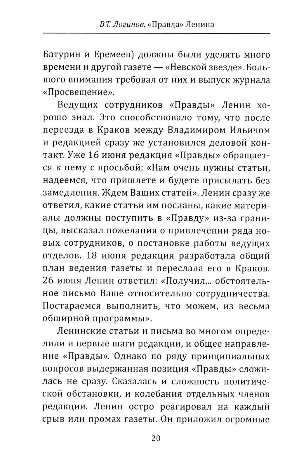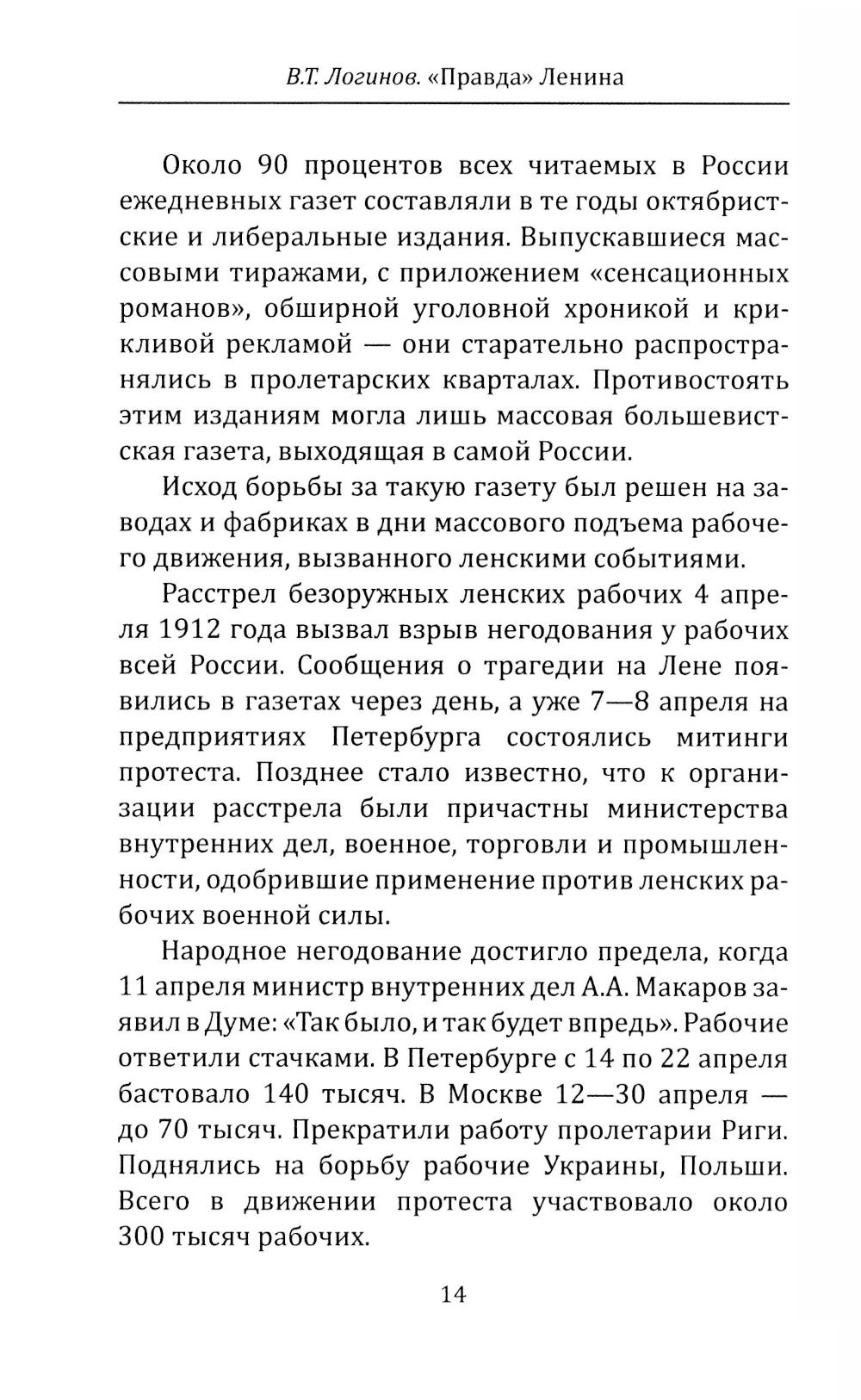 «Газета должна идти впереди всех», - так писал В. И. Ленин в редакцию «Правды». Однотонность и запаздывание несовместимы с газетным делом, утверждал он: газета, которая отстаёт, погибает. В своей книге Владлен Терентьевич Логинов (1929-2025), крупнейший исследователь жизни и деятельности Ленина, рассказывает о том, как создавалась главная большевистская газета, откуда брались средства на её издание, как ей удалось выстоять под натиском жесточайших правительственных репрессий, почему в кратчайший срок она стала одной из самых популярных газет России. Книга содержит множество живых фактов и интересных подробностей, связанных с работой «Правды».| Издательство | Родина |