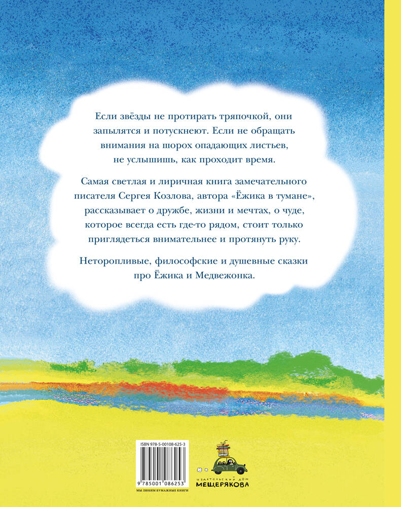 Если звёзды не протирать тряпочкой, они запылятся и потускнеют. Если не обращать внимания на шорох опадающих листьев, не услышишь, как проходит время. Самая светлая и лиричная книга замечательного писателя Сергея Козлова рассказывает о дружбе, жизни и мечтах, о чуде, которое всегда есть где-то рядом, стоит только приглядеться внимательнее и протянуть руку.| Издательство | Издательский Дом Мещерякова АО |