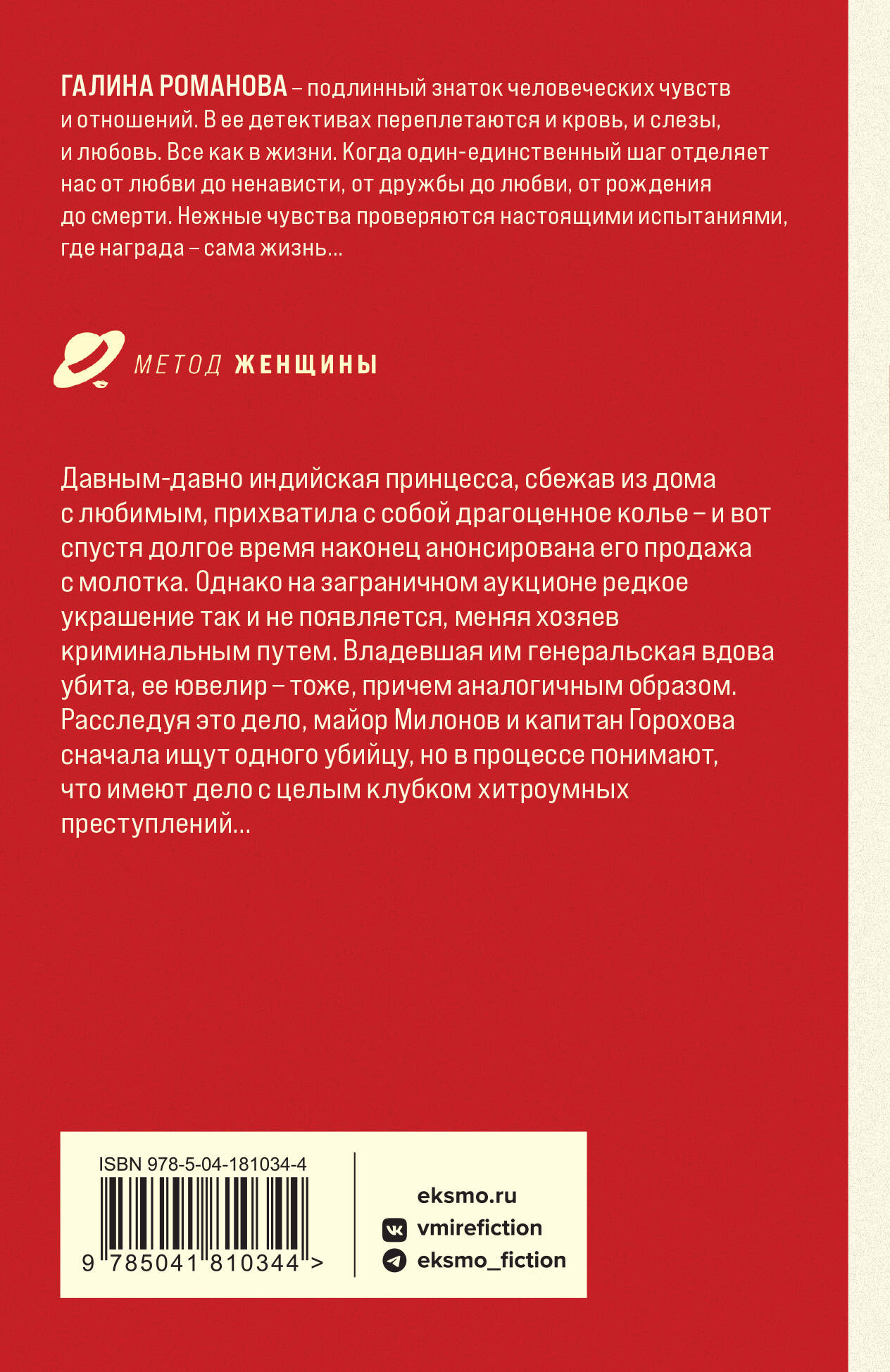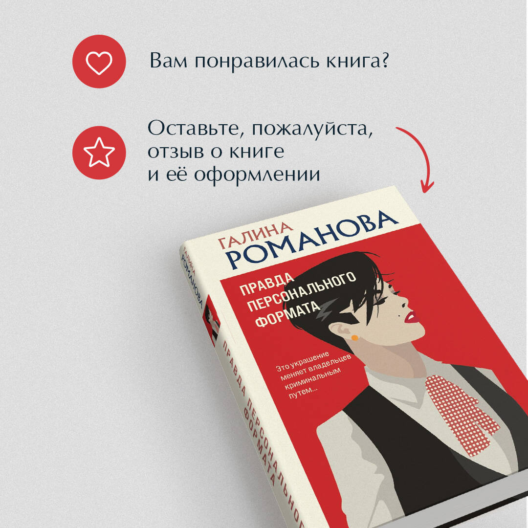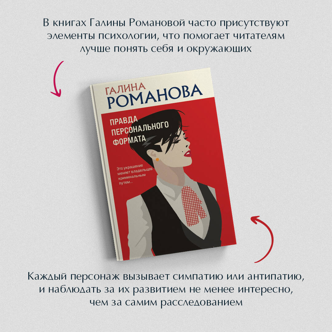 Давным-давно индийская принцесса, сбежав из дома с любимым, прихватила с собой драгоценное колье - и вот спустя долгое время наконец анонсирована его продажа с молотка. Однако на заграничном аукционе редкое украшение так и не появляется, меняя хозяев криминальным путем. Владевшая им генеральская вдова убита, ее ювелир - тоже, причем, аналогичным образом. Расследуя это дело, майор Милонов и капитан Горохова сначала ищут одного убийцу, но в процессе понимают, что имеют дело с целым клубком хитроумных преступлений… Книга Галины Романовой «Правда персонального формата» - очень интригующая и трогательная история о том, насколько мы ответственны за то, что делаем со своей собственной жизнью. Несколько увлекательных сюжетных линий, повествующих о судьбах разных людей, развиваются параллельно, чтобы в финале сплестись в тугой узел, когда все тайны будут раскрыты, а злодеи - выведены на чистую воду.| Издательство | ООО "Издательство "Эксмо" |