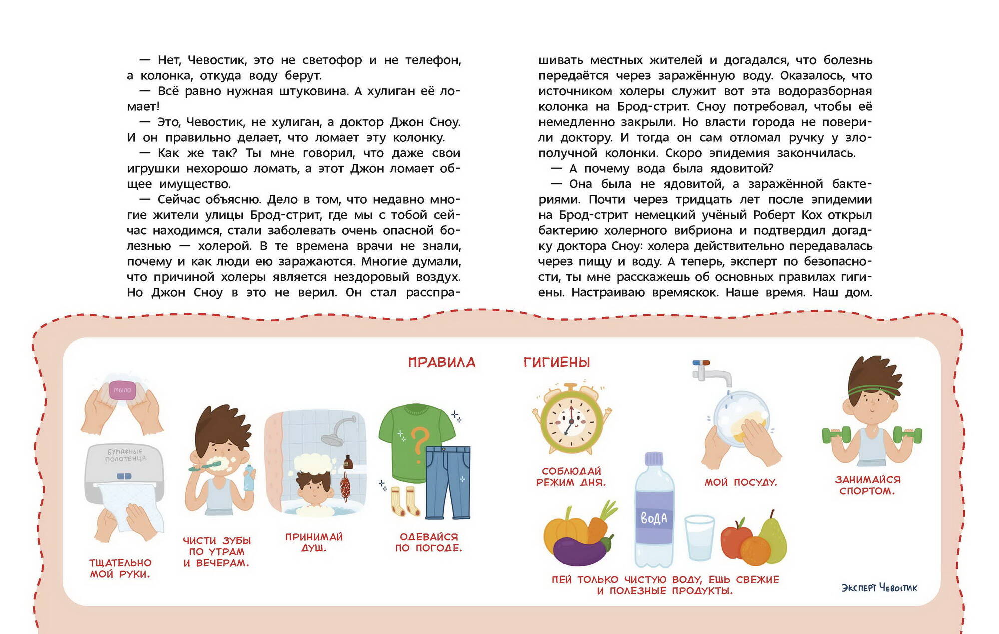 Из этой энциклопедии ребята узнают, как не попасть в опасную ситуацию. Вместе с Чевостиком и дядей Кузей они отправятся на детскую площадку, в бассейн и на стройку, напишут правила безопасного поведения, поймут, как избежать пожара и как вести себя при стихийных бедствиях. А еще познакомятся с правилами дорожного движения и основами гигиены.