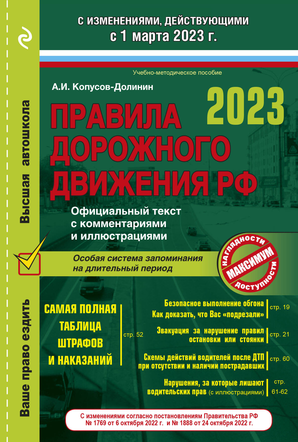 О чем эта книга Издание представляет собой текст ПДД в редакции, вступающей в силу с 1 марта 2023 года, с профессиональными авторскими комментариями.Всем, кто ценит свое время и хочет быстро выучить Правила дорожного движения без изнурительной зубрежки, эта книга станет незаменимым помощником. В чем уникальность книги Представлена авторская методика запоминания, которая гарантирует максимально эффективную передачу информации и ее усвоение на длительный период. Книга выдержала более десятка переизданий и продолжает пользоваться спросом. Здесь присутствуют все самые последние изменения в ПДД. Комментарии и иллюстрации делают процесс обучение непринужденным. Также в книге вы найдете удобную таблицу штрафов с самыми последними изменениями, которая пригодится в различных ситуациях на дороге. Для кого книга Для тех, кто ответственно подходит к обучению и не любит тратить свое время на бездумное заучивание. Для изучающих ПДД самостоятельно и в автошколах и всех, кто хочет восполнить пробелы в знаниях . Об авторе Алексей Иванович Копусов-Долинин является автором первой в России системной методики подготовки надежного водителя. Его пособия присутствуют на рынке уже более двадцати лет и принесли автору всероссийское признание. Большинство российских автошкол рекомендуют своим учащимся именно его книги для подготовки к сдаче экзаменов в ГИБДД.
