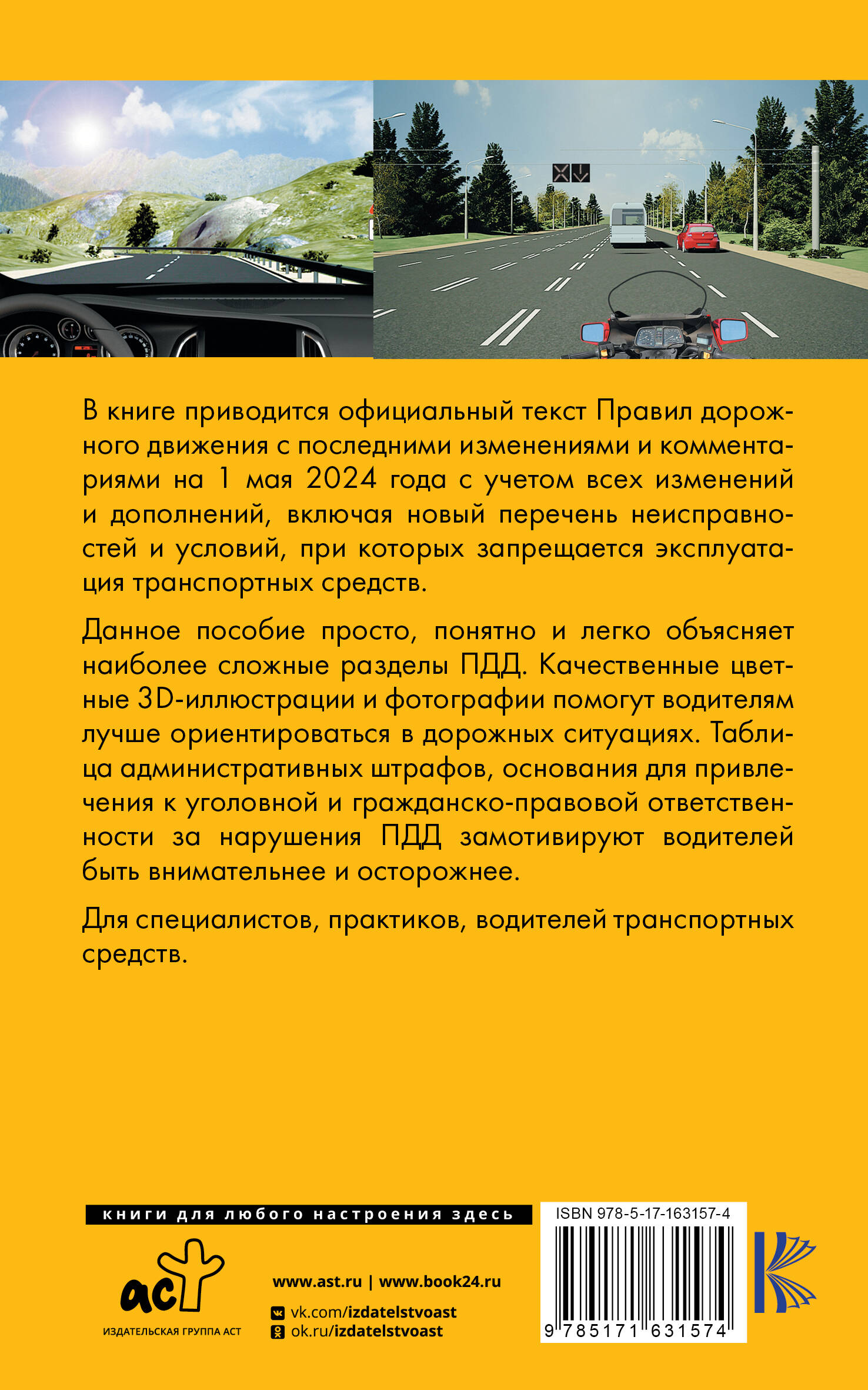 В книге приводится официальный текст Правил дорожного движения с последними изменениями и комментариями на 1 мая 2024 года, включая новый перечень неисправностей и условий, при которых запрещается эксплуатация транспортных средств. Данное пособие просто, понятно и легко объясняет наиболее сложные разделы ПДД. Качественные цветные 3D-иллюстрации и фотографии помогут водителям лучше ориентироваться в дорожных ситуациях. Таблица административных правонарушений, нормы УК РФ и ГК РФ, предусматривающие ответственность за нарушения ПДД замотивируют водителей быть внимательнее и осторожнее. Для специалистов, практиков, водителей транспортных средств. Издание учитывает все изменения, опубликованные в официальных источниках на момент подписания издания в печать.| Издательство | Издательство "АСТ" |