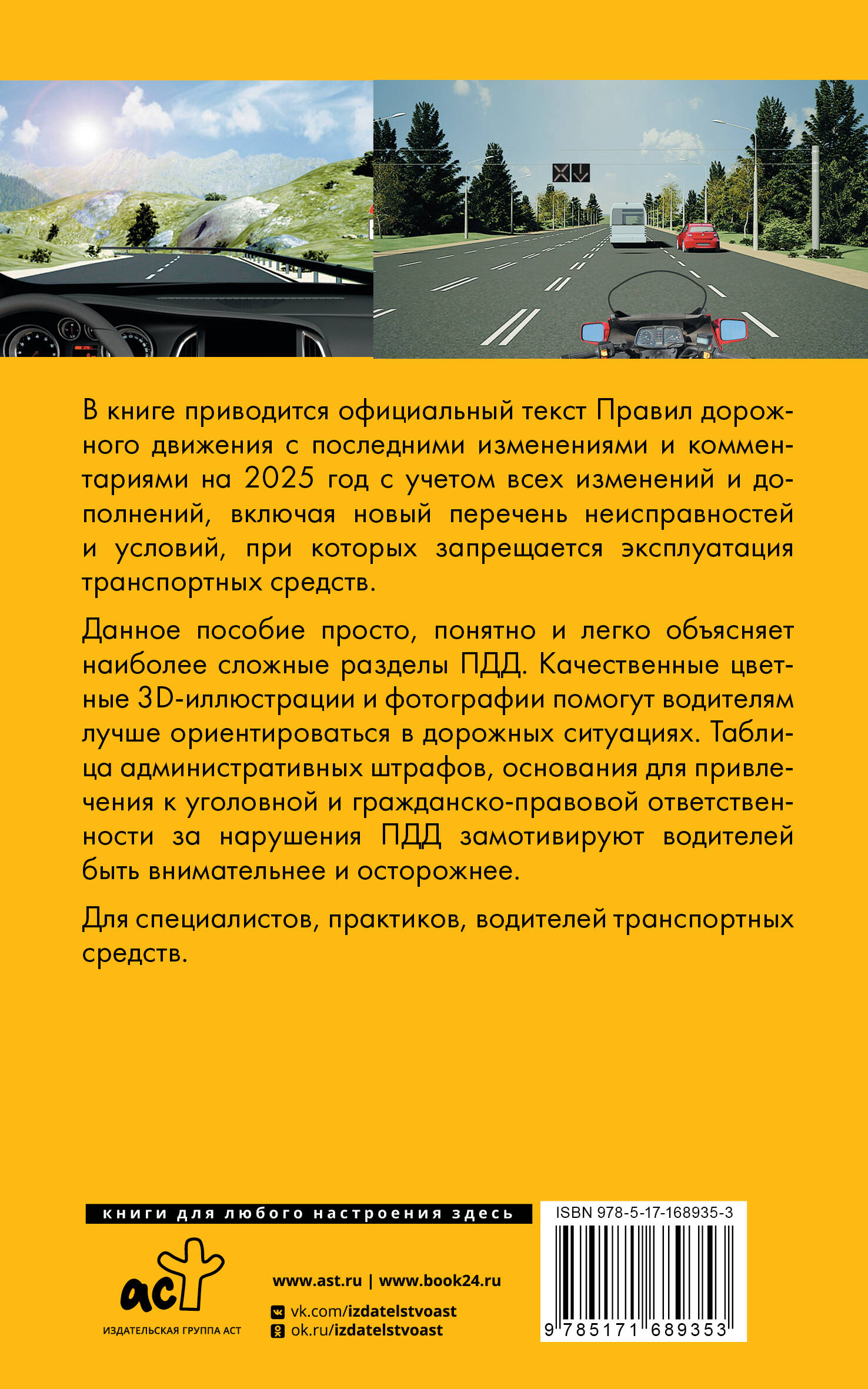 В книге приводится официальный текст Правил дорожного движения с последними изменениями и комментариями на 2025 год, включая новый перечень неисправностей и условий, при которых запрещается эксплуатация транспортных средств. Данное пособие просто, понятно и легко объясняет наиболее сложные разделы ПДД. Качественные цветные 3D-иллюстрации и фотографии помогут водителям лучше ориентироваться в дорожных ситуациях. Таблица административных правонарушений, нормы УК РФ и ГК РФ, предусматривающие ответственность за нарушения ПДД, замотивируют водителей быть внимательнее и осторожнее. Для специалистов, практиков, водителей транспортных средств. Издание учитывает все изменения, опубликованные в официальных источниках на момент подписания издания в печать.| Издательство | Издательство "АСТ" |