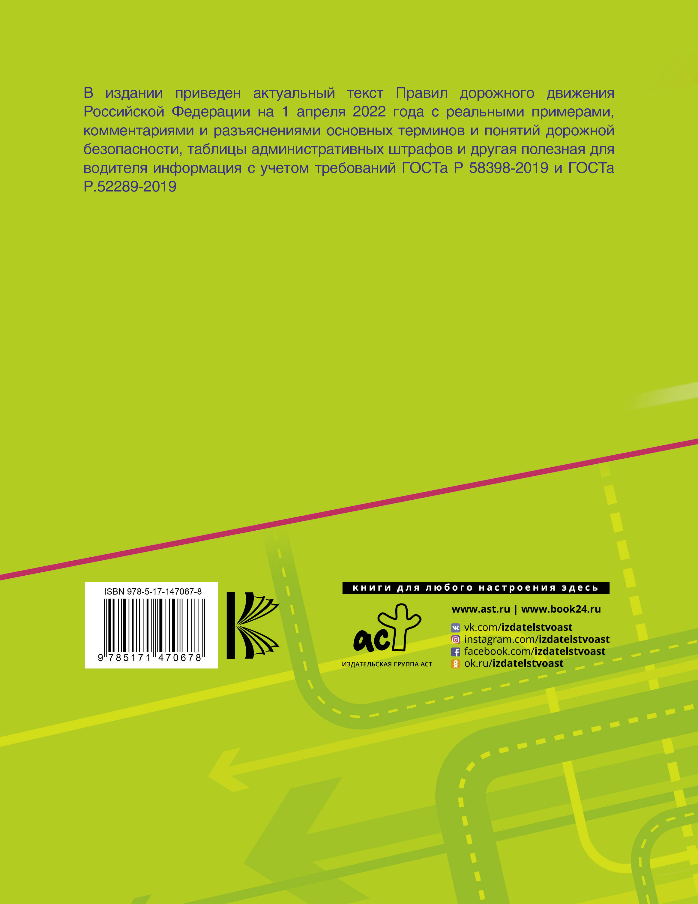 В издании приведен актуальный текст Правил дорожного движения Российской Федерации на 1 апреля 2022 года с реальными примерами, комментариями и разъяснениями основных терминов и понятий дорожной безопасности, таблица административных штрафов, советы и другая полезная для водителя информация с учетом требований ГОСТа Р 51256-2018, ГОСТа Р 58398-2019 и ГОСТа Р 52289-2019. В качестве иллюстраций в книге используется современная 3D-графика с реалистичным изображением дорожных ситуаций и обстановки. Для специалистов, практиков, водителей транспортных средств и для тех. кто еще только собирается ими стать.| Издательство | АСТ |
