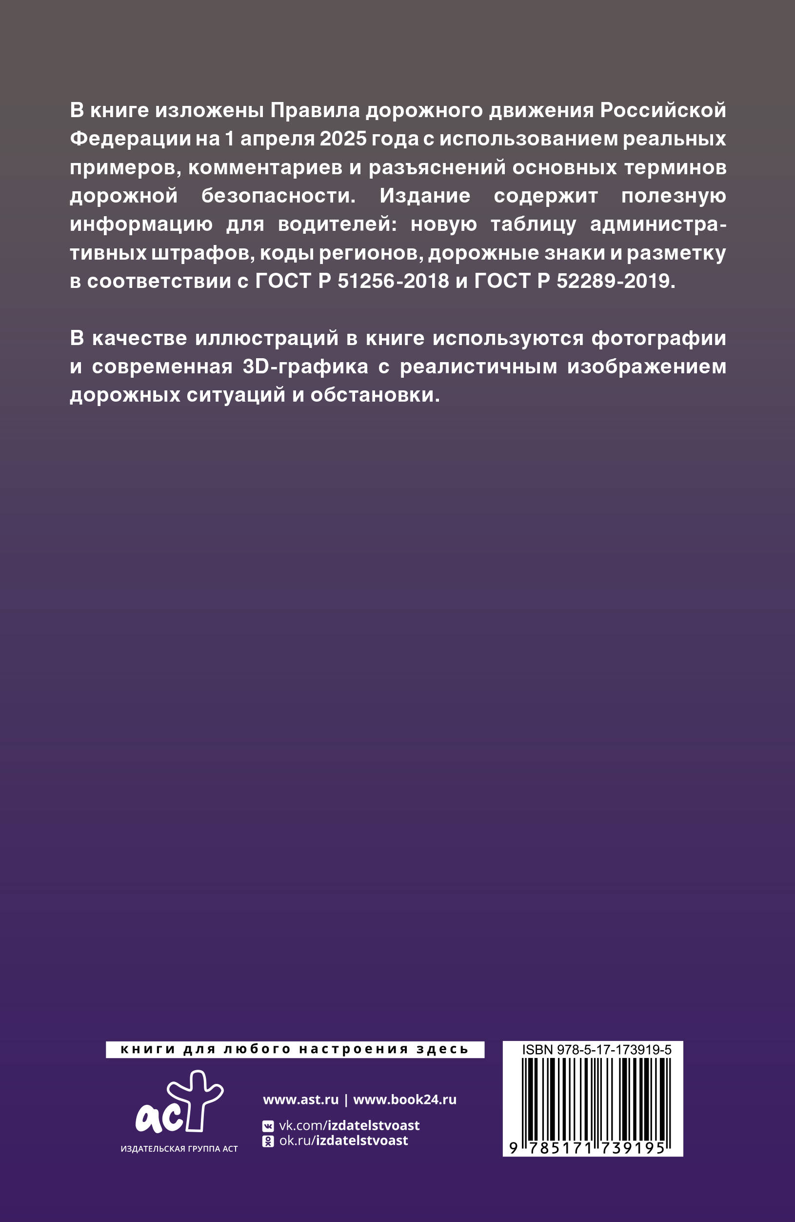 В книге изложены Правила дорожного движения Российской Федерации на 1 апреля 2025 года с использованием реальных примеров, комментариев и разъяснений основных терминов дорожной безопасности. Издание содержит полезную информацию для водителей: новую таблицу административных штрафов, коды регионов, дорожные знаки и разметку в соответствии с ГОСТ Р 51256-2018 и ГОСТ Р 52289-2019. В качестве иллюстраций в книге используются фотографии и современная 3D-графика с реалистичным изображением дорожных ситуаций и обстановки. Для специалистов, практиков, водителей транспортных средств. Издание учитывает все изменения, опубликованные в официальных источниках на момент подписания издания в печать.| Издательство | Издательство "АСТ" |
