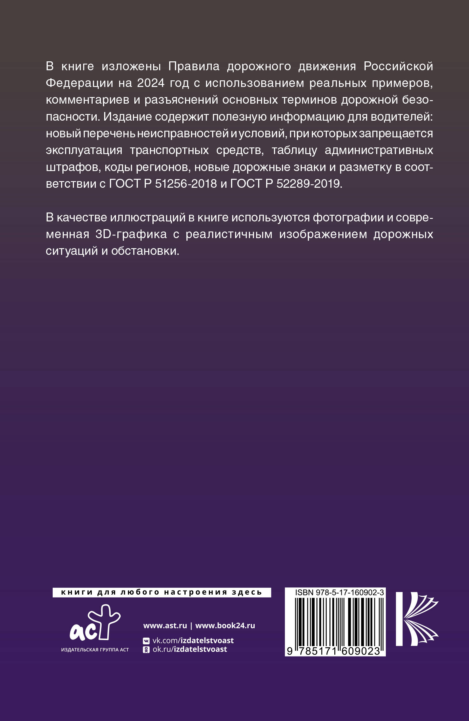 В книге изложены Правила дорожного движения Российской Федерации на 2024 год с использованием реальных примеров, комментариев и разъяснений основных терминов дорожной безопасности. Издание содержит полезную информацию для водителей: таблицу административных штрафов, коды регионов, новые дорожные знаки и разметку в соответствии с ГОСТ Р 51256-2018 и ГОСТ Р 52289-2019. В качестве иллюстраций в книге используются фотографии и современная 3D-графика с реалистичным изображением дорожных ситуаций и обстановки. Для специалистов, практиков, водителей транспортных средств. Издание учитывает все изменения, опубликованные в официальных источниках на момент подписания издания в печать.| Издательство | ИЗДАТЕЛЬСТВО "АСТ" |