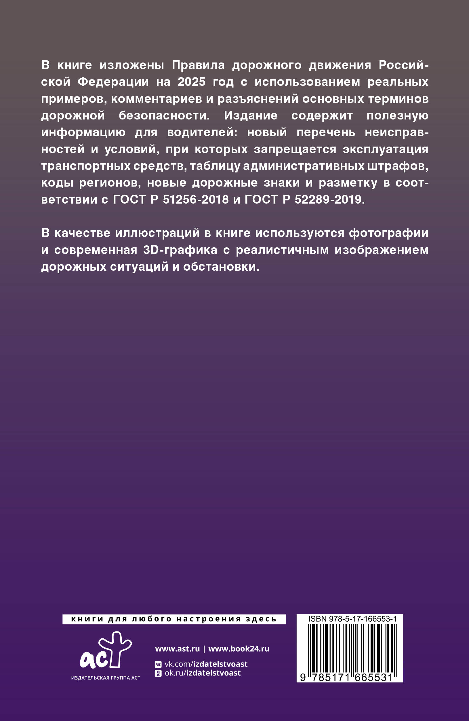 В книге изложены Правила дорожного движения Российской Федерации на 2025 год с использованием реальных примеров, комментариев и разъяснений основных терминов дорожной безопасности. Издание содержит полезную информацию для водителей: таблицу административных штрафов, коды регионов, новые дорожные знаки и разметку в соответствии с ГОСТ Р 51256-2018 и ГОСТ Р 52289-2019. В качестве иллюстраций в книге используются фотографии и современная 3D-графика с реалистичным изображением дорожных ситуаций и обстановки. Для специалистов, практиков, водителей транспортных средств. Издание учитывает все изменения, опубликованные в официальных источниках на момент подписания издания в печать.| Издательство | Издательство "АСТ" |