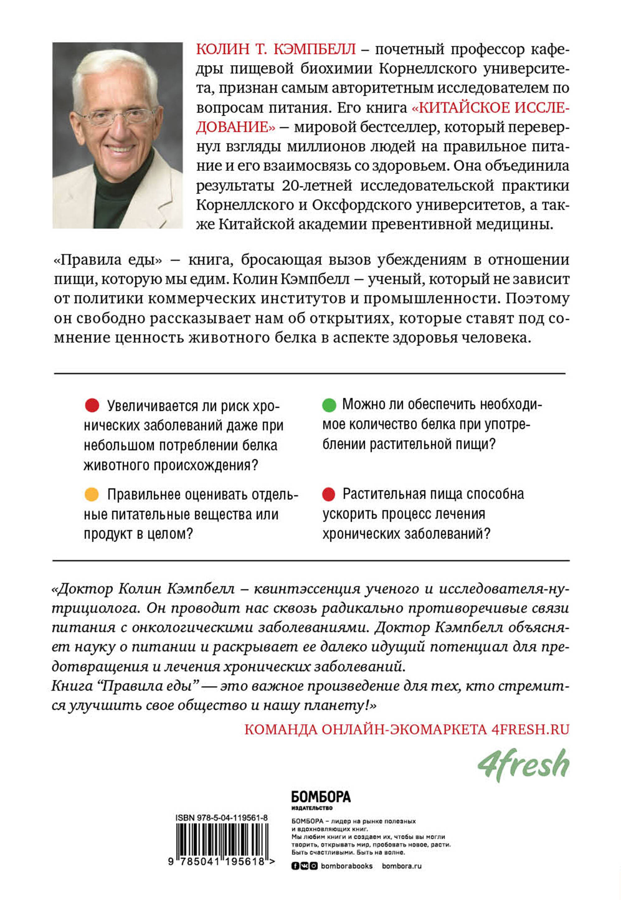 Большинство из нас считает, что животный белок полезен и его нечем заменить. Но имеет ли это убеждение реальные основания? Доктор Кэмпбелл, ученый-новатор и влиятельнейший специалист в области нутрициологии, когда-то перевернул это представление. Его наблюдения, опубликованные в "Китайском исследовании", поразили весь мир и стали предметом большой дискуссии. В своей новой книге "Правила еды" он пошел еще дальше и еще глубже исследовал аспекты и преимущества цельной растительной пищи. Эта книга - альтернативная точка зрения на устоявшиеся правила здорового питания и фундаментальный труд по нутрициологии. Ее автор предлагает каждому переосмыслить пищевые привычки, руководствуясь не популярными мифами и устаревшими догмами, а научно доказанной базой знаний. Он рассматривает историю возникновения заболеваний и методы их лечения, анализирует нынешнее состояние индустрии питания и определяет основные правила диеты, основанной на цельных растительных продуктах. И, главное, объясняет, как при помощи такого рациона можно уберечься от рака, болезней сердца и сосудов и диабета. Какой баланс веществ нужно соблюдать, чтобы питание было действительно правильным? Почему суперфуды - это не панацея? Как сложился культ белка, и чем он обернулся для современного общества? Что такое принцип холизма в питании? На эти и другие важные вопросы доктор Кэмпбелл подробно отвечает в этой удивительной книге, искренне надеясь, что в будущем люди смогут дольше оставаться здоровыми, вести полноценную жизнь и наслаждаться своим долголетием.| Издательство | ООО "Издательство "Эксмо" |