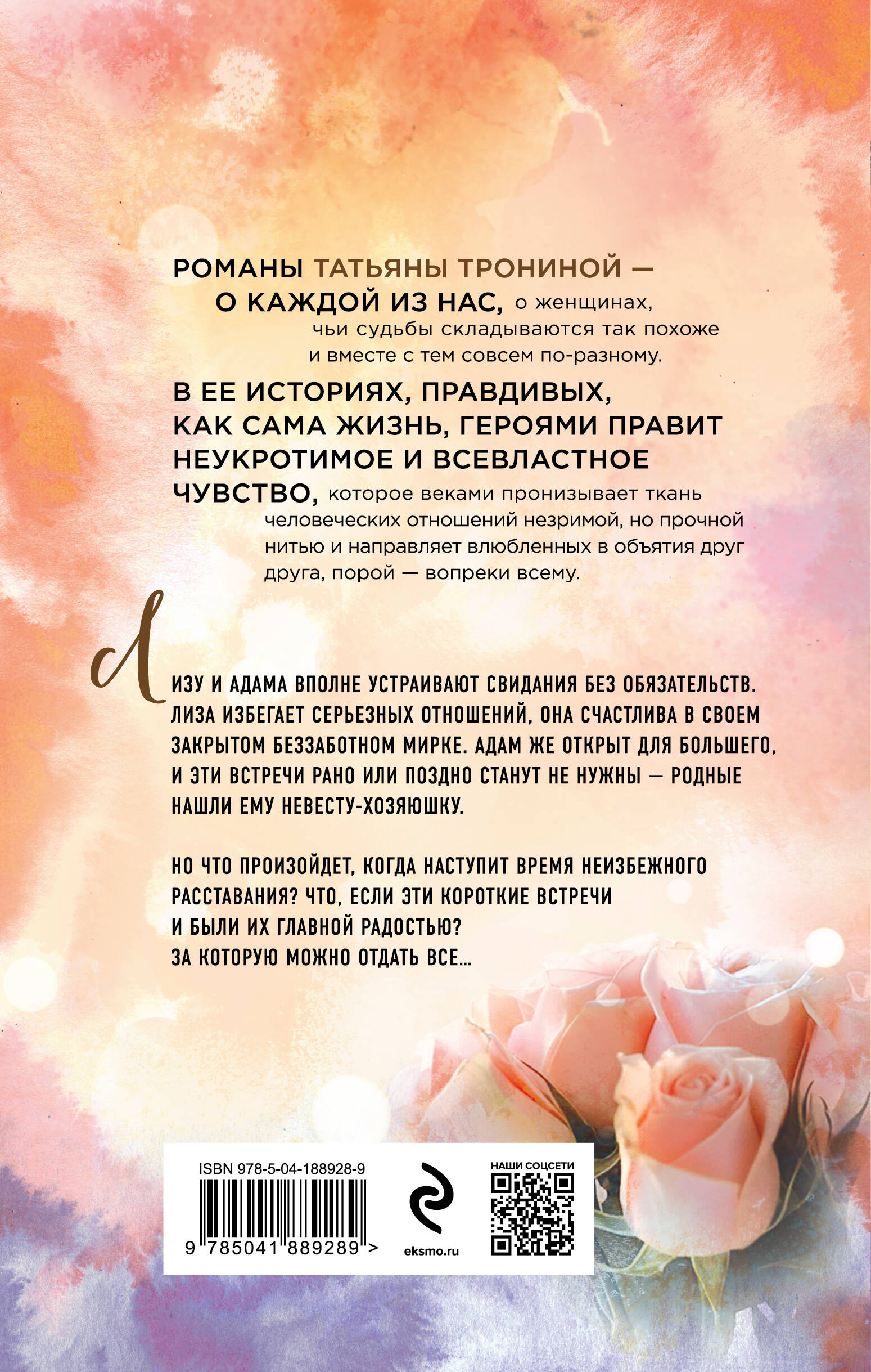 Татьяна Тронина - один из самых читаемых авторов в жанре мелодрамы. Эмоции, накал и непременно в каждой истории - сложный и важный выбор, от которого зависит многое, если не все. Лизу и Адама вполне устраивают свидания без обязательств. Лиза избегает серьезных отношений, она счастлива в своем закрытом беззаботном мирке. Адам же открыт для большего, и эти встречи рано или поздно станут не нужны - родные нашли ему невесту-хозяюшку. Но что произойдет, когда наступит время неизбежного расставания? Что, если эти короткие встречи и были их главной радостью? За которую можно отдать все…| Издательство | ООО "Издательство "Эксмо" |
