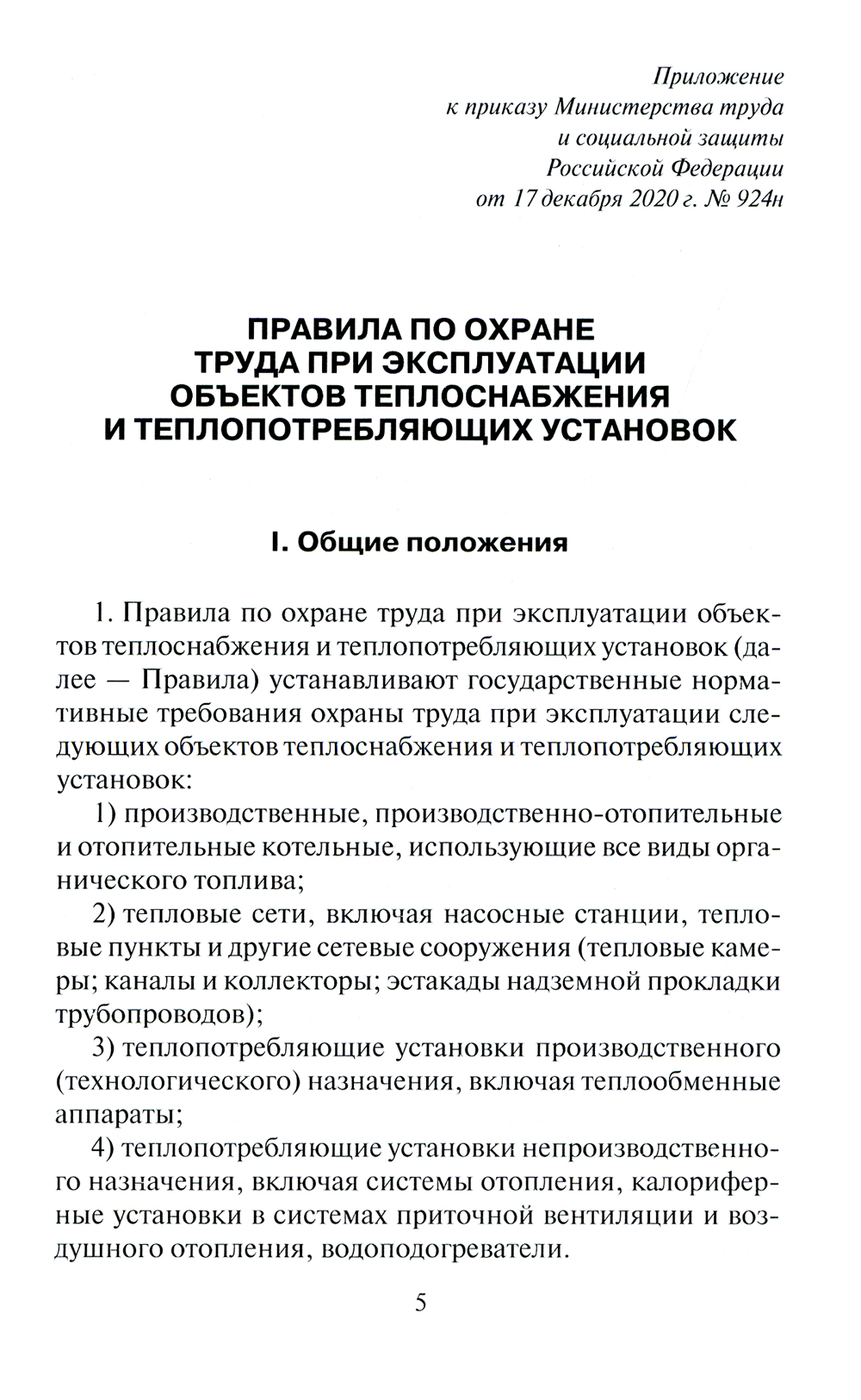 Правила по охране труда при эксплуатации объектов теплоснабжения и теплопотребляющих установок устанавливают государственные нормативные требования охраны труда при эксплуатации следующих объектов теплоснабжения и теплопотребляющих установок: производственные, производственно-отопительные и отопительные котельные, использующие все виды органического топлива; тепловые сети, включая насосные станции, тепловые пункты и другие сетевые сооружения (тепловые камеры; каналы и коллекторы; эстакады надземной прокладки трубопроводов); теплопотребляющие установки производственного (технологического) назначения, включая теплообменные аппараты; теплопотребляющие установки непроизводственного назначения, включая системы отопления, калориферные установки в системах приточной вентиляции и воздушного отопления, водоподогреватели. Правила утверждены приказом Министерства труда и социальной защиты Российской Федерации № 924н от 17.12.2020.| Издательство | Деан |