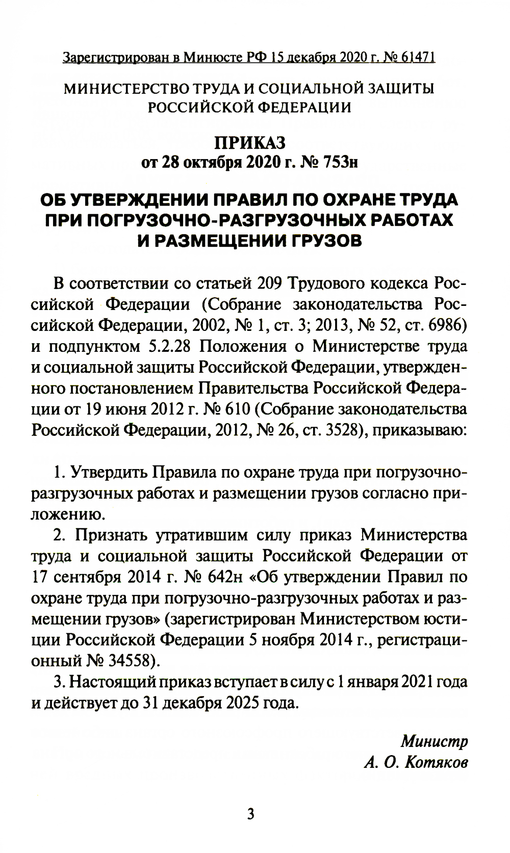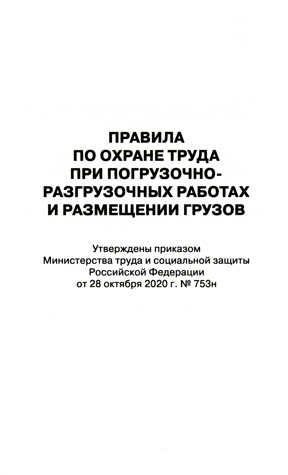 Правила по охране труда при погрузочно-разгрузочных работах и размещении грузов устанавливают государственные нормативные требования охраны труда при выполнении погрузочно-разгрузочных работ, транспортировке, размещении и хранении грузов. Правила обязательны для исполнения работодателями - юридическими и физическими лицами независимо от их организационно-правовых форм, осуществляющими погрузочно-разгрузочные работы и размещение грузов, и работниками, выполняющими погрузочно-разгрузочные работы. Утверждены приказом Министерства труда и социальной защиты Российской Федерации от 28 октября 2020 г. № 753н «Об утверждении Правил по охране труда при погрузочно-разгрузочных работах и размещении грузов». Вступают в действие с 1 января 2021 г. Издание соответствует официально опубликованному тексту документа.
