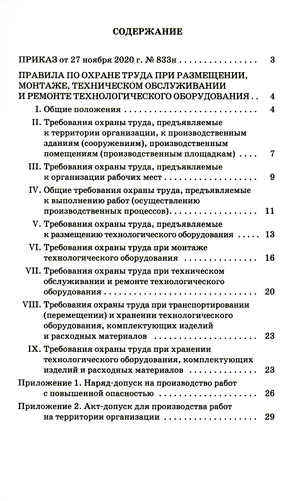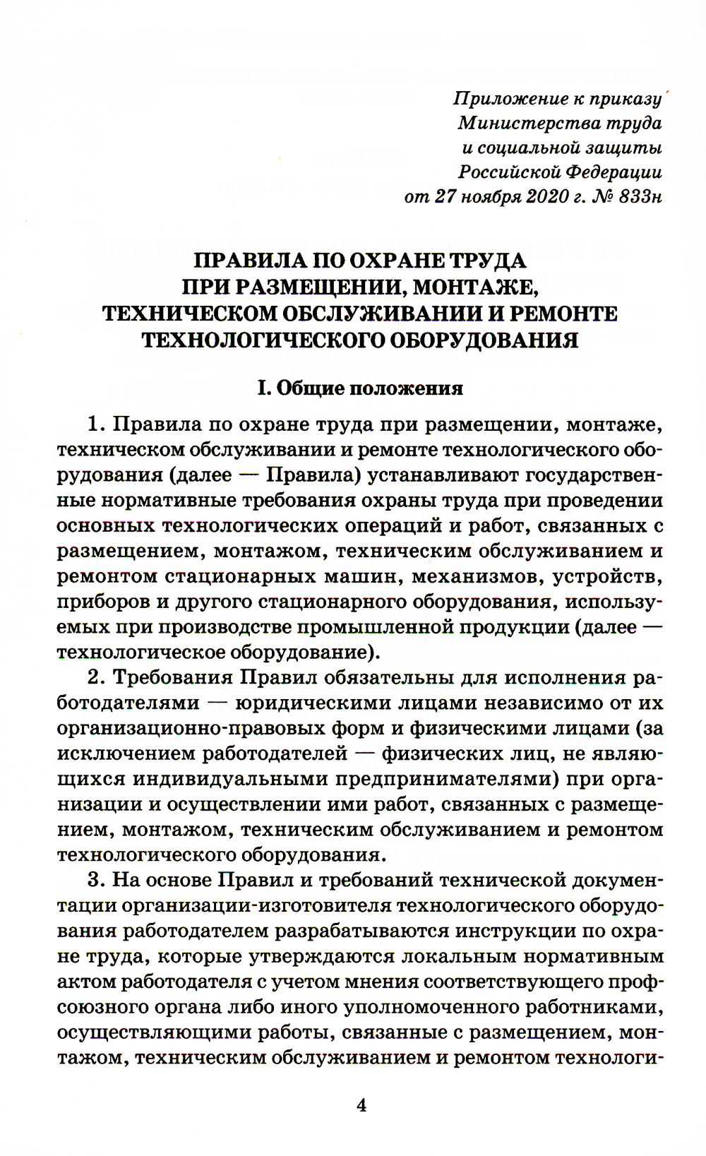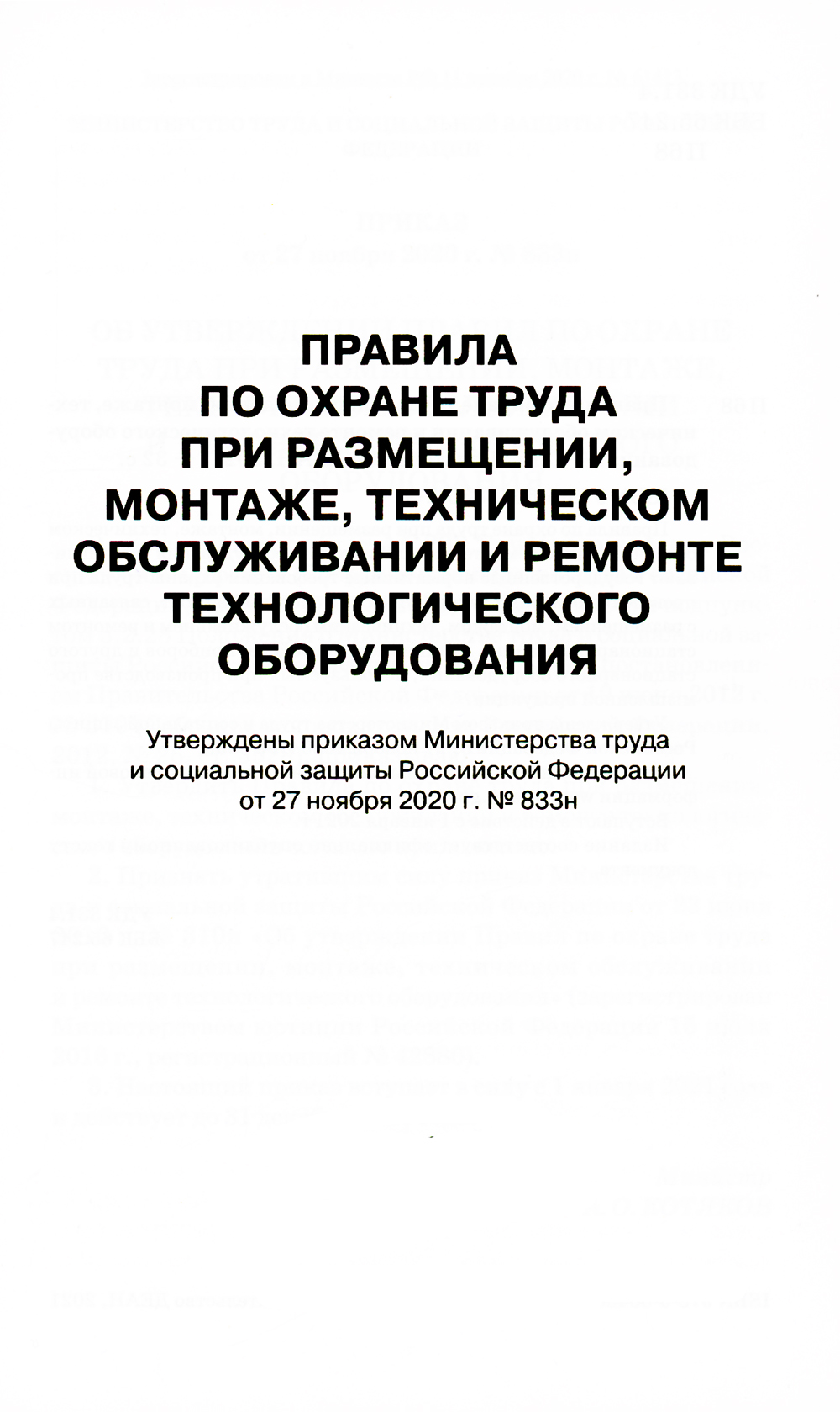 Правила по охране труда при размещении, монтаже, техническом обслуживании и ремонте технологического оборудования устанавливают государственные нормативные требования охраны труда при проведении основных технологических операций и работ, связанных с размещением, монтажом, техническим обслуживанием и ремонтом стационарных машин, механизмов, устройств, приборов и другого стационарного оборудования, используемых при производстве промышленной продукции. Утверждены приказом Министерства труда и социальной защиты Российской Федерации от 27 ноября 2020 г. № 833н. Вступают в действие с 1 января 2021 г. Издание соответствует официально опубликованному тексту документа.| Издательство | Деан |