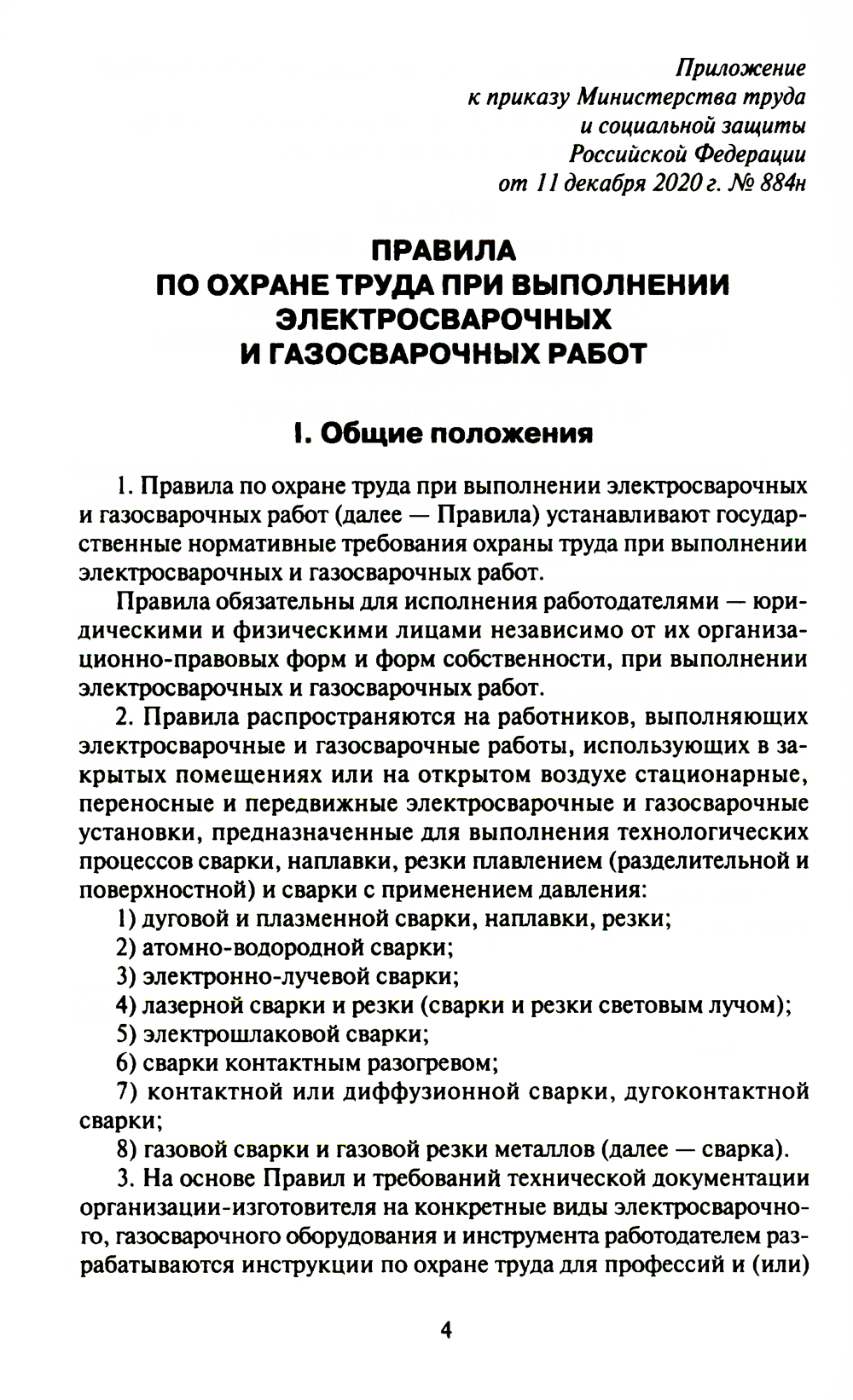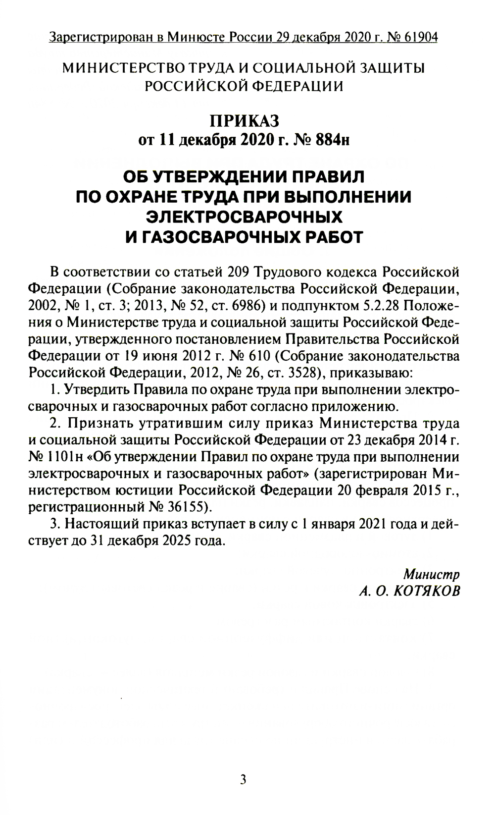 Правила по охране труда при выполнении электросварочных и газосварочных работ.Приказ Мин.труда и соц.защиты РФ от 11.12.2020 г.№884н