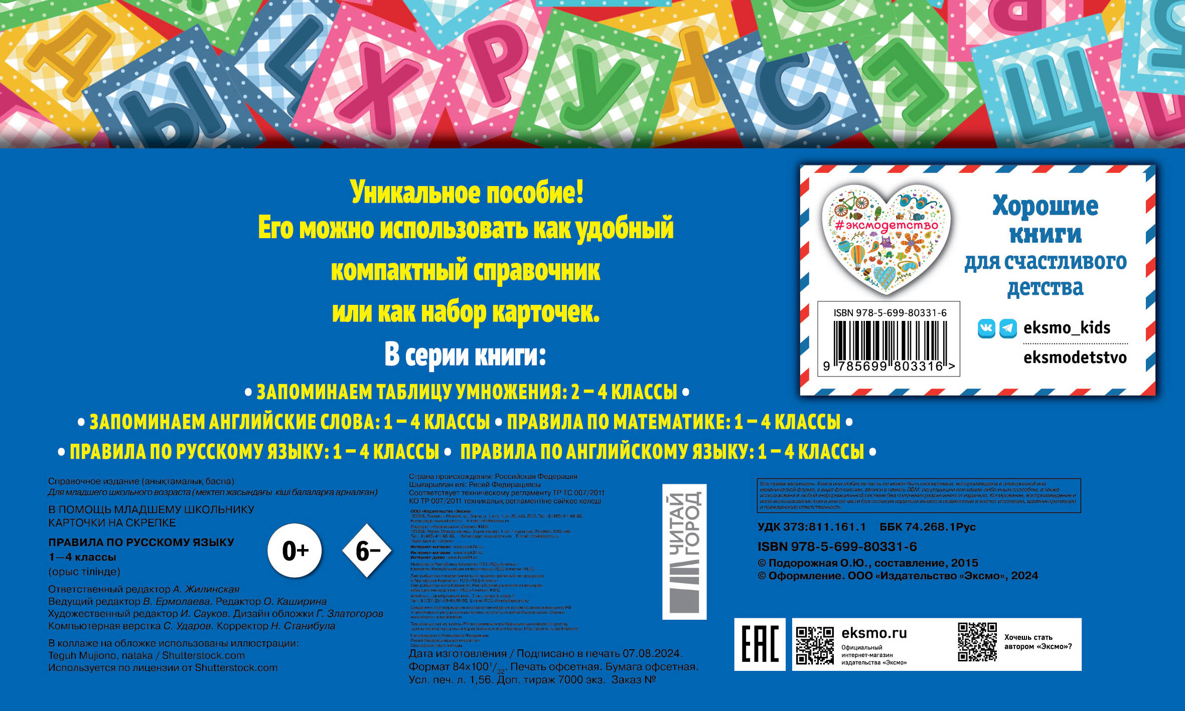 Пособие предназначено для самостоятельной работы учащихся 1-х-4-х классов и соответствует требованиям ФГОС. В доступной форме представлены основные правила по русскому языку: правила переноса; правописание сочетаний ЖИ, ШИ, ЧА, ЩА, ЧУ, ЩУ, ЧК, ЧН, НЧ, ЩН; буквы И и Ы после Ц; разделительный Ъ и Ь; проверяемые согласные в корне, безударные гласные в корне; правописание приставок ПРЕ- и ПРИ-; Ь после шипящих на конце существительных; ТСЯ и ТЬСЯ в глаголах и т. д. Страницы книги можно вырезать по пунктирной линии, специально отмеченной в книге ножницами, и использовать как карточки, выкладывать которые можно при прохождении темы, чтобы акцентировать внимание на правилах, или повесить над столом. Покупая пособие своему ребенку, вы поможете ему: 1) лучше усвоить правила, 2) систематизировать знания, 3) быстрее выполнить домашнее задание или подготовиться к контрольным работам, 4) улучшить успеваемость по предмету.