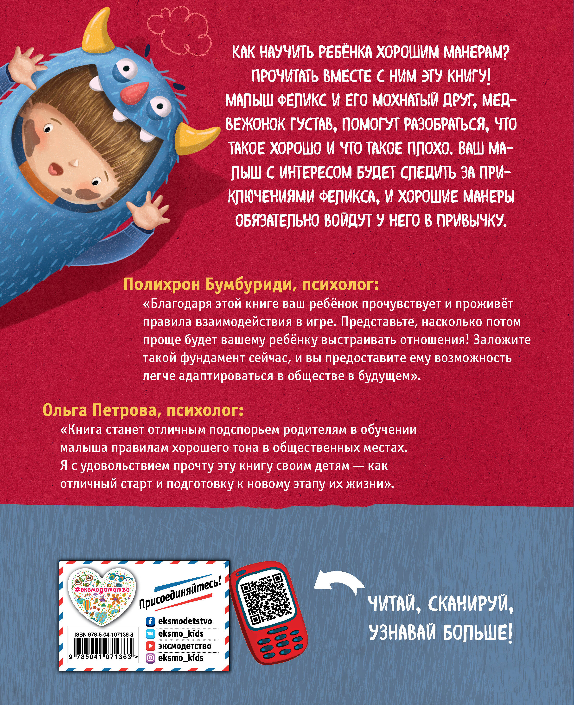 Как научить ребенка хорошим манерам? Прочитать вместе с ним эту книгу! Малыш Феликс и его мохнатый друг, медвежонок Густав, помогут разобраться, что такое хорошо и что такое плохо. Ваш малыш с интересом будет следить за приключениями Феликса, и хорошие манеры обязательно войдут у него в привычку.| Издательство | ООО "Издательство "Эксмо" |