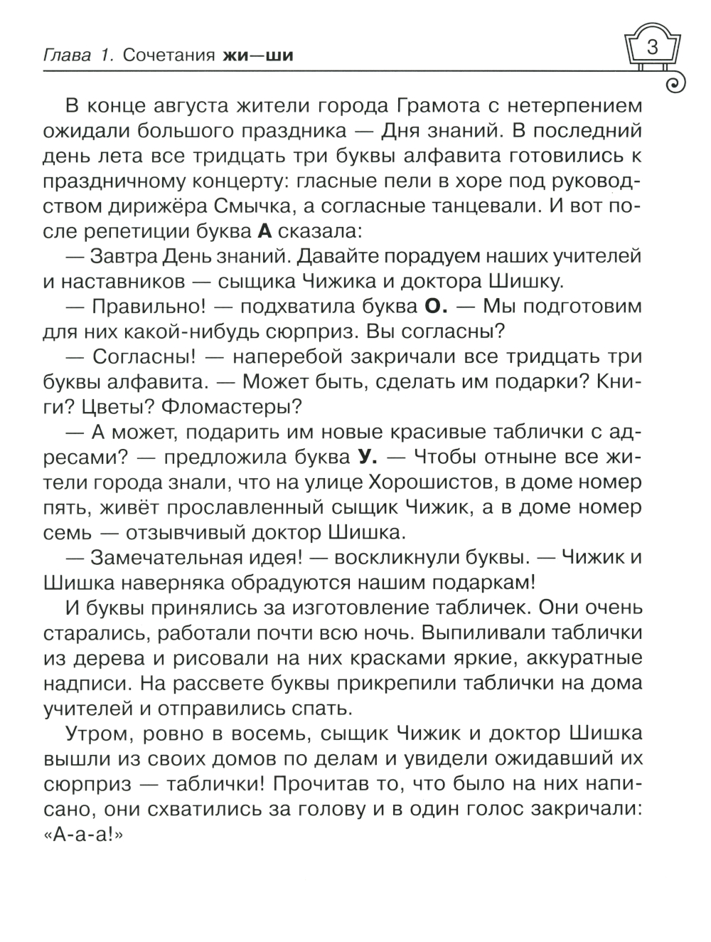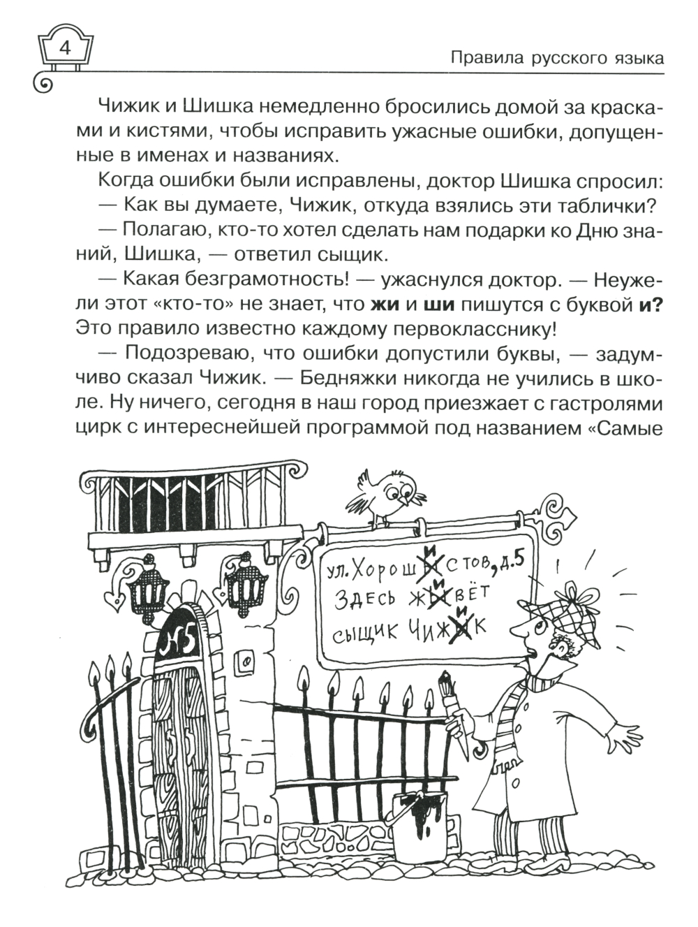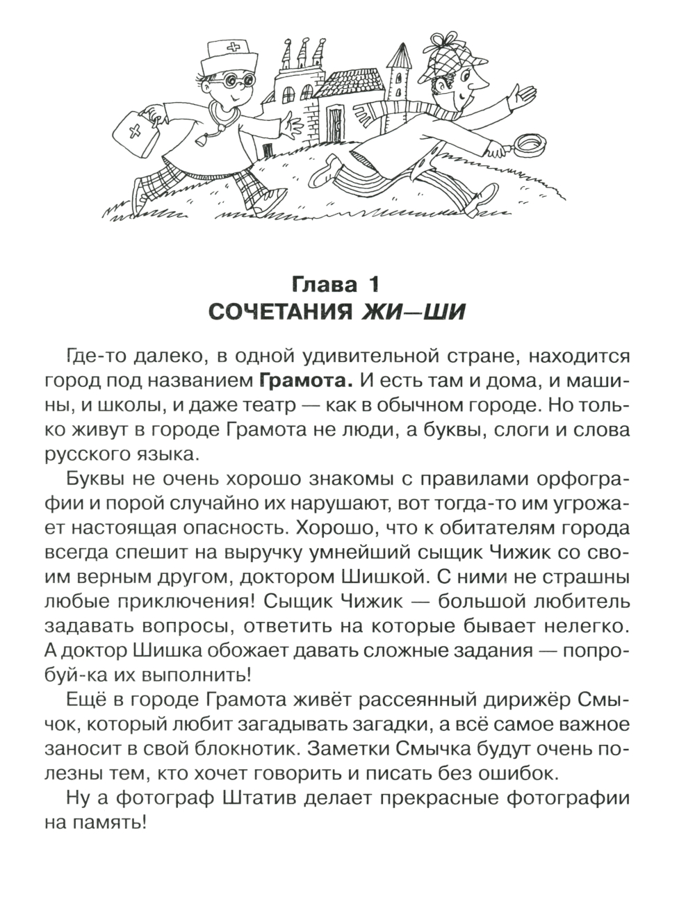 Книга адресована младшим школьникам. В игровой форме в ней объясняются правила русского языка. Закрепить знания ученику помогут тренировочные упражнения с ответами. На страницах книги ребёнок встретится с персонажами, которые порой нарушают правила русского языка, и тогда им угрожают настоящие опасности. Но на помощь им всегда придут сыщик Чижик, доктор Шишка и дирижёр Смычок. В занимательной форме каждому ребёнку будет легко понять и запомнить трудные законы орфографии и научиться писать без ошибок.| Издательство | ИД ЛИТЕРА |
