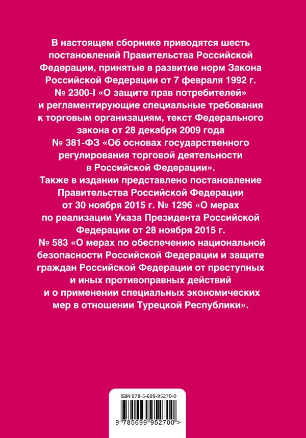 В настоящем сборнике приводятся постановления Правительства Российской Федерации, принятые в развитие норм Закона Российской Федерации от 7 февраля 1992 г. № 2300-I «О защите прав потребителей» и регламентирующие специальные требования к торговым организациям.