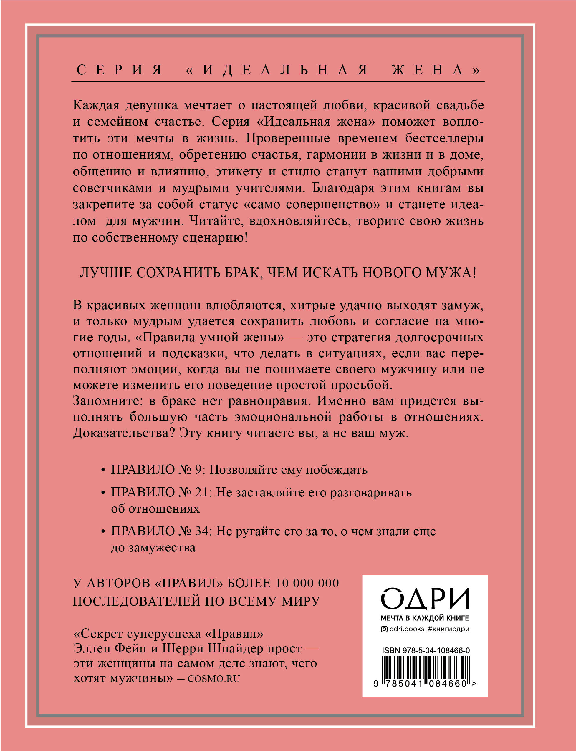 Что такое «Правила умной жены» и зачем они нужны (отрывок из книги): «Когда в 1995 году мы написали «Правила», то изучили всё, что работает и что не работает в период ухаживания. Мы заметили, что женщины, которых «трудно добиться», всегда получают своих мужчин, а чересчур доступные или озабоченные женщины частенько терпят неудачу. Мы составили 35 правил, которые помогали женщинам стать для мужчин желанными: «не заговаривайте с мужчинами первой», «заканчивайте свидание первой» и другие. Сколь бы трудны они ни были, но первые 3 - 4 месяца отношений нужно им следовать. В некоторых случаях стоит следовать им до тех пор, пока мужчина не сделает предложение: после этого вы уже понимаете, что он готов принять на себя обязательства, и можно немного расслабиться. Брак же - это предприятие долгосрочное, поэтому «Правила умной жены» не так строги, но должны стать образом жизни. Правила для свиданий - это короткая диета: не стоит сразу заниматься сексом, желательно несколько месяцев оставаться таинственной и загадочной, чтобы он потерял от вас голову… (практически то же самое, что несколько месяцев отказываться от десерта, чтобы к лету влезть в свой купальник). «Правила умной жены» - это план на всю жизнь. Любая может скинуть пять килограммов, но далеко не все способны сохранить этот результат. Многим женщинам удается поймать мужчину, но сколько из них счастливы в браке? Наша задача на сей раз - не поймать мужчину, а удержать его. И для этого нужно сделать его счастливым, чтобы он чувствовал себя значимым. Следует быть чуткой, уметь играть в команде и… кое-что еще - прилагать все усилия, чтобы не пилить мужа и поддерживать его идеи и предложения. А для этого нужно потрудиться. К сожалению, большую часть эмоциональной работы в браке придется выполнять вам - нравится вам это или нет. Это дело не взаимное. Доказательства? Подумайте: эту книжку читаете вы, а не ваш муж. Он наверняка читает триллер или книгу о том, как заработать больше денег на фондовом рынке. Мы не обобщаем. Просто такова жизнь. Вашему партнеру может даже не понравиться то, что вы читаете эту книгу или обсуждаете ваши семейные проблемы с подругами или матерью. Подобно большинству мужчин, он не любит обсуждать с посторонними свою личную жизнь и считает, что вы вполне можете решить свои проблемы самостоятельно вместе с ним, поэтому мы не советуем обсуждать эту книгу с мужем или просить его ее прочитать. Даже если он согласится с большинством наших рекомендаций, ему не понравится, что вам пришлось прочитать книгу, чтобы понять, как к нему относиться. В действительности, чтобы семейная жизнь была счастливой, женщине следует относиться к мужу, как к клиенту, которого хочется сохранить (он всегда прав). Вы, наверное, думаете: «А почему нельзя жить на равных? Почему не он должен поступать так, как вы советуете, то есть не начинать первым ссору и первым идти на примирение?» Наш ответ прост: потому что такова жизнь. Мужчины и женщины разные. Они играют неодинаковые роли на этапе ухаживания, когда мужчина должен быть охотником. И в браке, когда большая часть эмоциональной работы в отношениях ложится на плечи женщин. Мы не собираемся это менять. Мы были бы рады дать вам иной совет, но наши основаны на человеческой природе, нравится она вам или нет. И поэтому они работают. Так что не пытайтесь заставить партнера и