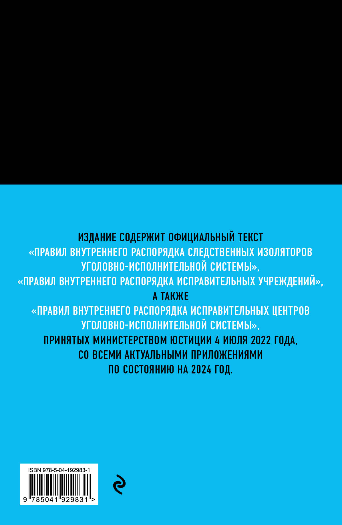 Издание содержит официальный текст "Правил внутреннего распорядка следственных изоляторов уголовно-исполнительной системы", "Правил внутреннего распорядка исправительных учреждений", а также "Правил внутреннего распорядка исправительных центров уголовно‑исполнительной системы" принятых Министерством юстиции 4 июля 2022 г. № 110 со всеми актуальными приложениями.