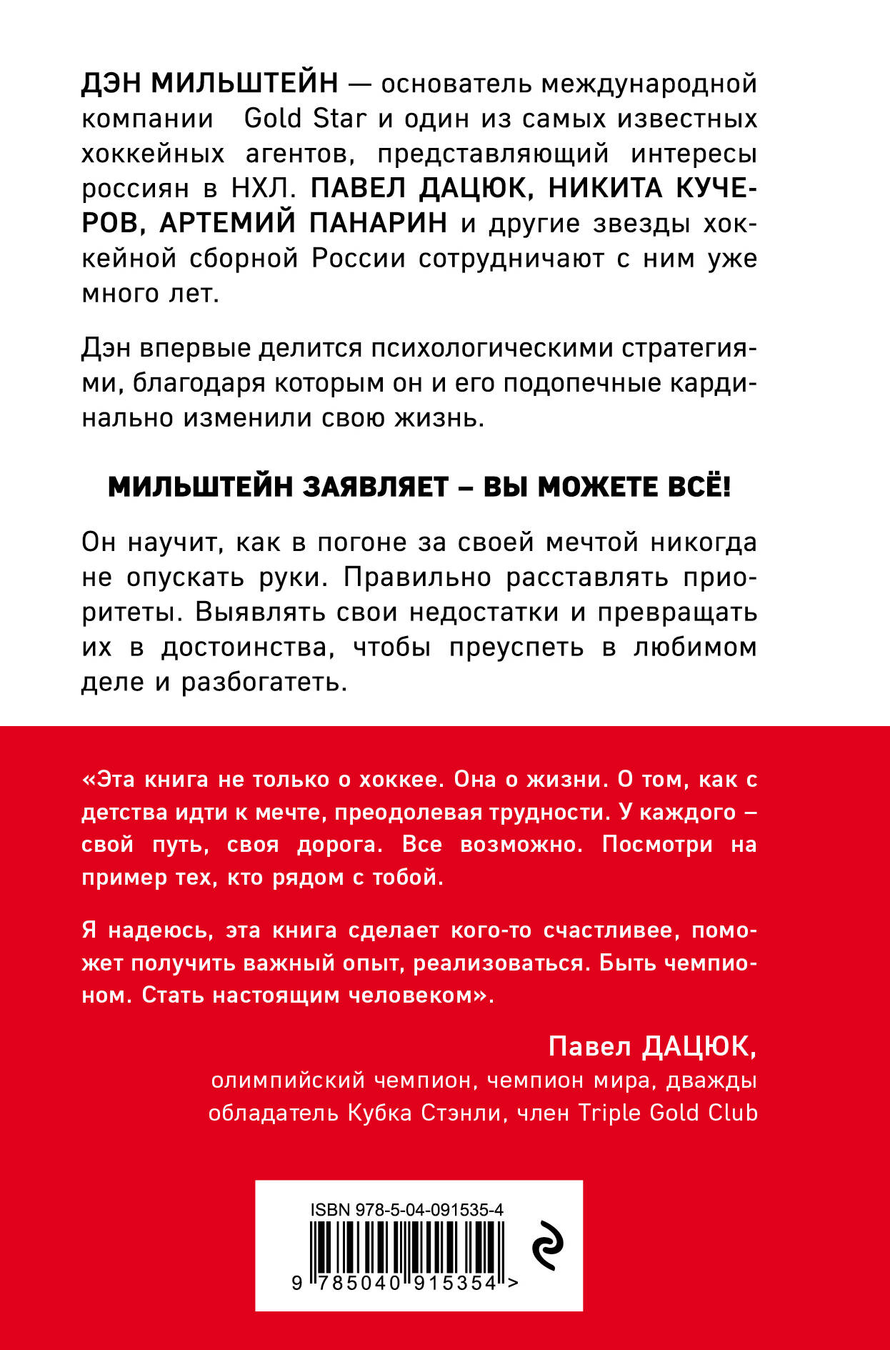 Дэн Мильштейн - основатель компании GoldStar и один из самых известных хоккейных агентов, представляющий интересы россиян в НХЛ. Благодаря ему Павел Дацюк, Никита Кучеров, Артемий Панарин и другие звезды хоккейной сборной России добились больших успехов за рубежом. Дэн впервые делится психологическими стратегиями, благодаря которым он и его подопечные кардинально изменили свою жизнь. Он научит, как в погоне за своей мечтой никогда не опускать руки. Правильно расставлять приоритеты. Выявлять свои недостатки и превращать их в достоинства, чтобы преуспеть в любимом деле и разбогатеть.| Издательство | ООО "Издательство "Эксмо" |