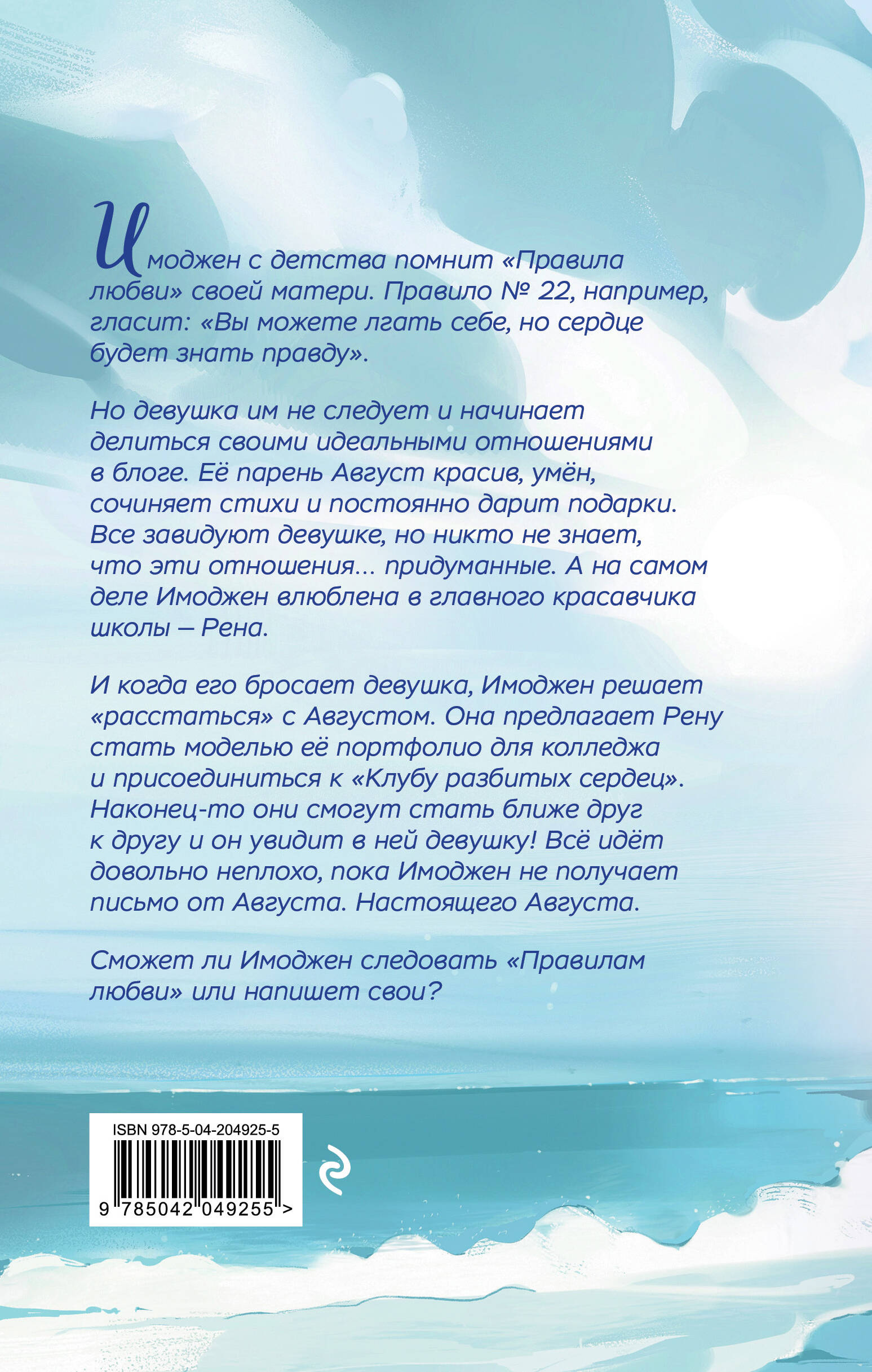 Романтический школьная комедия про идеальные отношения, которые… оказались фейком! Имоджен с детства помнит «Правила любви» своей матери. Правило № 22, например, гласит: «Вы можете лгать себе, но сердце будет знать правду». Но девушка им не следует и начинает делиться своими идеальными отношениями в блоге. Ее парень Август красив, умен, сочиняет стихи и постоянно дарит подарки. Все завидуют девушке, но никто не знает, что эти отношения… придуманные. А на самом деле Имоджен влюблена в главного красавчика школы - Рена. И когда его бросает девушка, Имоджен решает «расстаться» с Августом. Она предлагает Рену стать моделью ее портфолио для колледжа и присоединиться к «Клубу разбитых сердец». Наконец-то они смогут стать ближе друг к другу и он увидит в ней девушку! Все идет довольно неплохо, пока Имоджен не получает письмо от Августа. Настоящего Августа. Сможет ли Имоджен следовать «Правилам любви» или напишет свои?| Издательство | ООО "Издательство "Эксмо" |