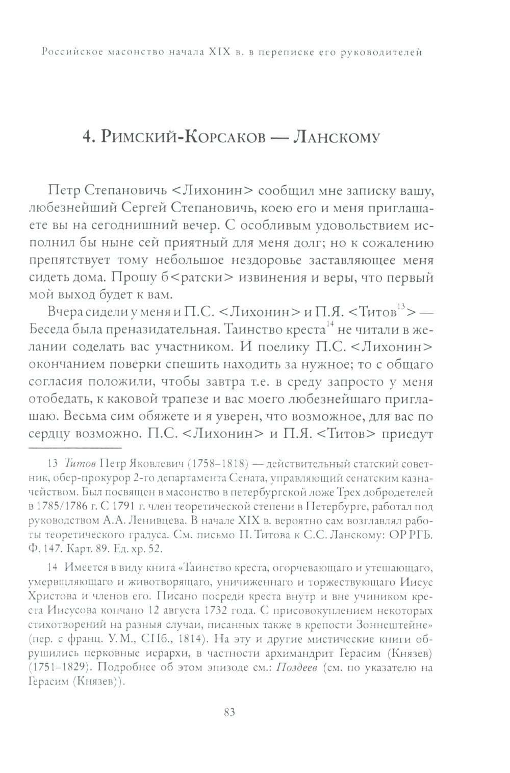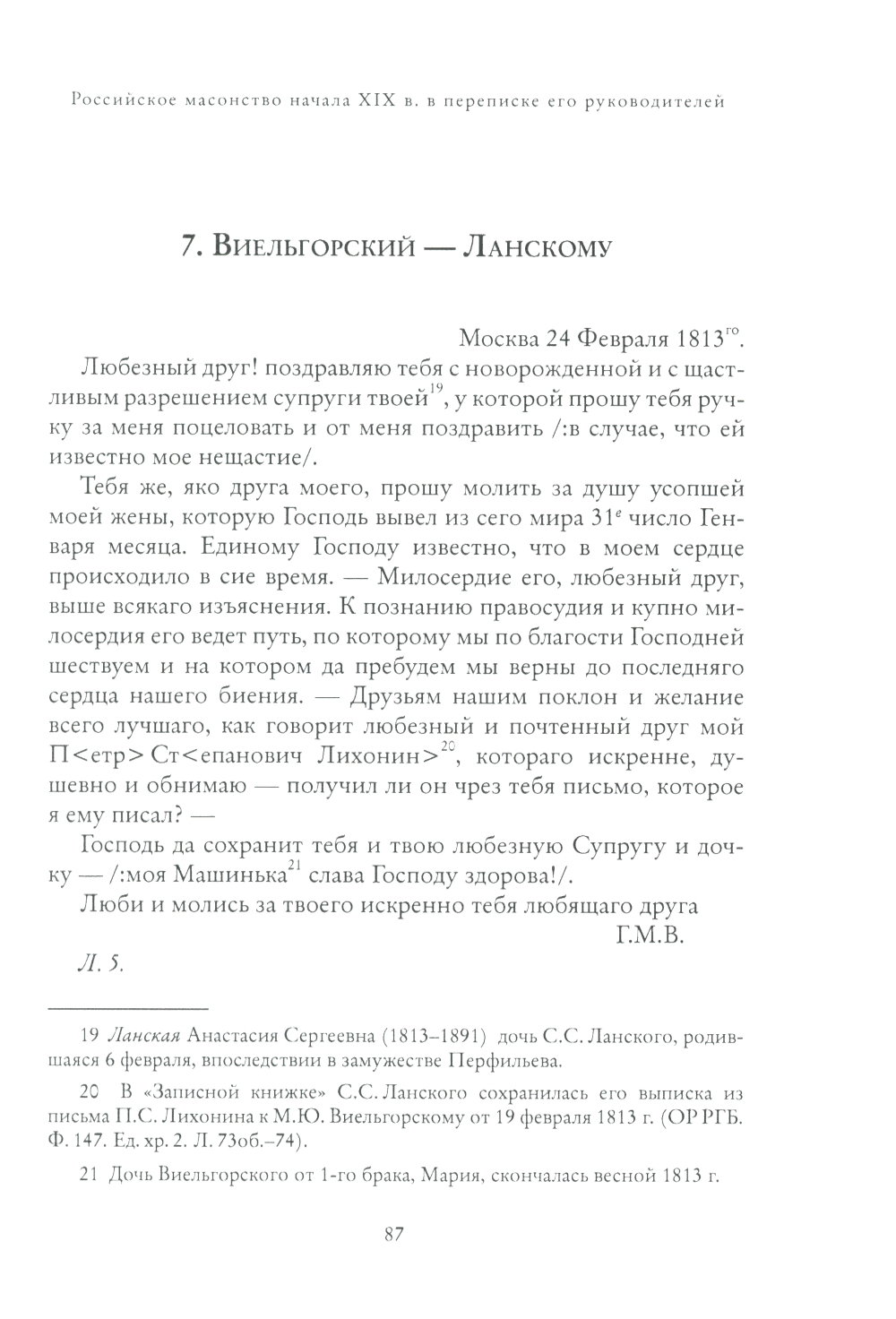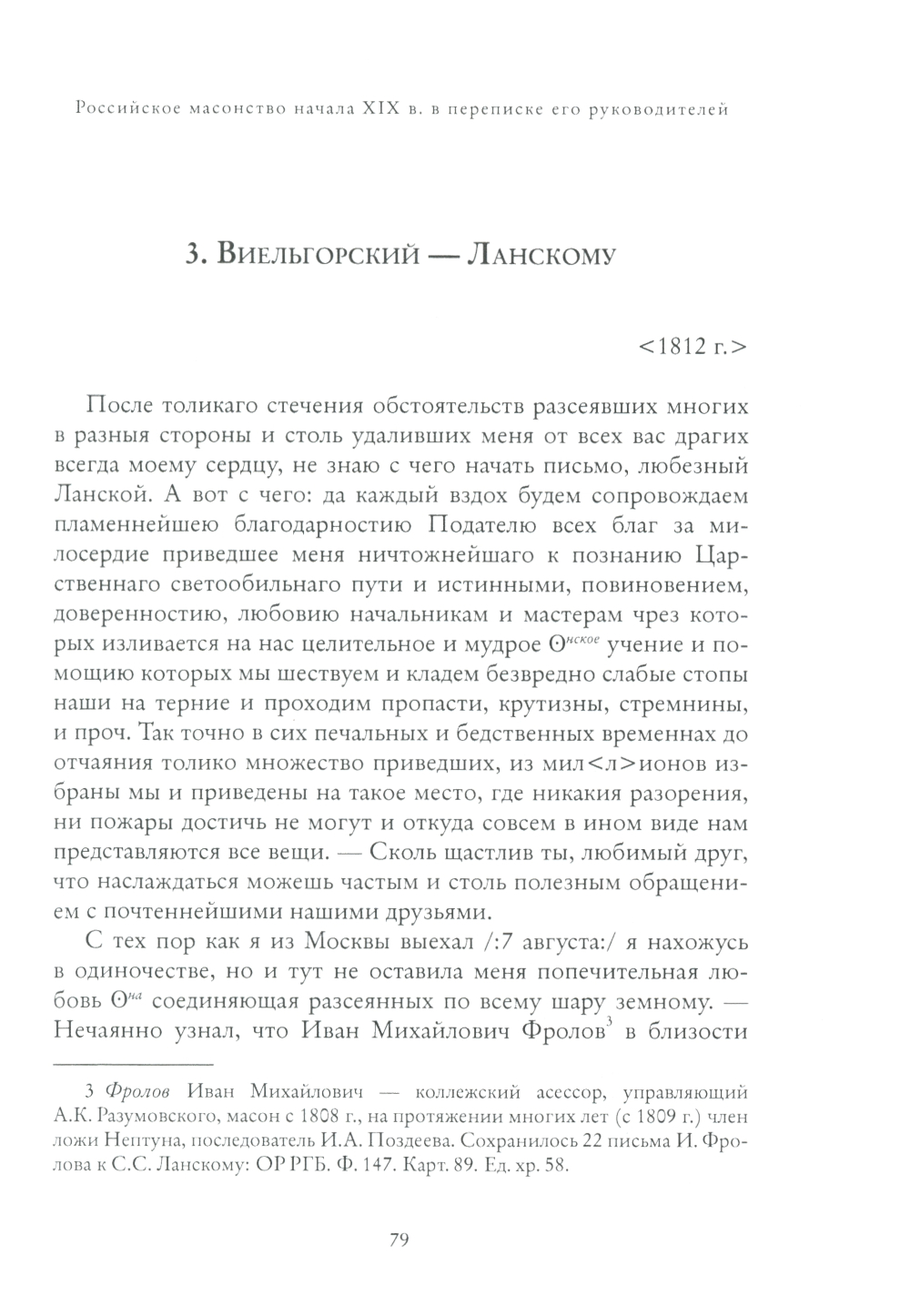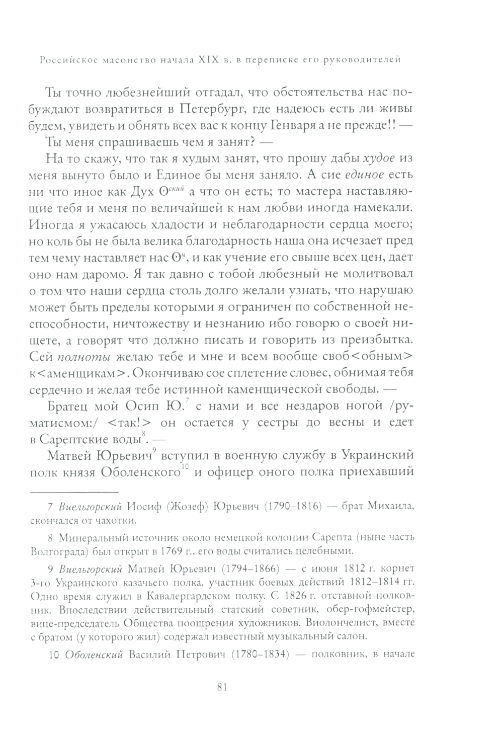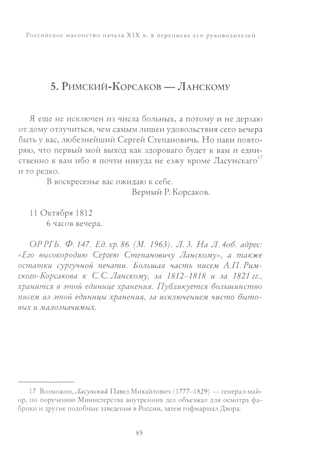 Перед читателем книга, которая преимущественно представляет собой публикацию переписки трех молодых масонов, учеников И.А. Поздеева, которые очень быстро прошли ступени масонской иерархии и фактически возглавляли в 1815-1822 гг. один из двух больших масонских союзов в России, Великую Провинциальную ложу. В период расцвета масонства, М.Ю. Виельгорский (аристократ, музыкант и душеприказчик А.С. Пушкина), С.С. Ланской (будущий министр внутренних дел) и А.П. Римский-Корсаков (отец композитора и будущий Новгородский и Волынский губернатор) почти полностью контролировали ситуацию в российском Ордене вольных каменщиков и определяли пути его развития. Публикуемая переписка является важнейшим источником для истории масонства в России XIX в.