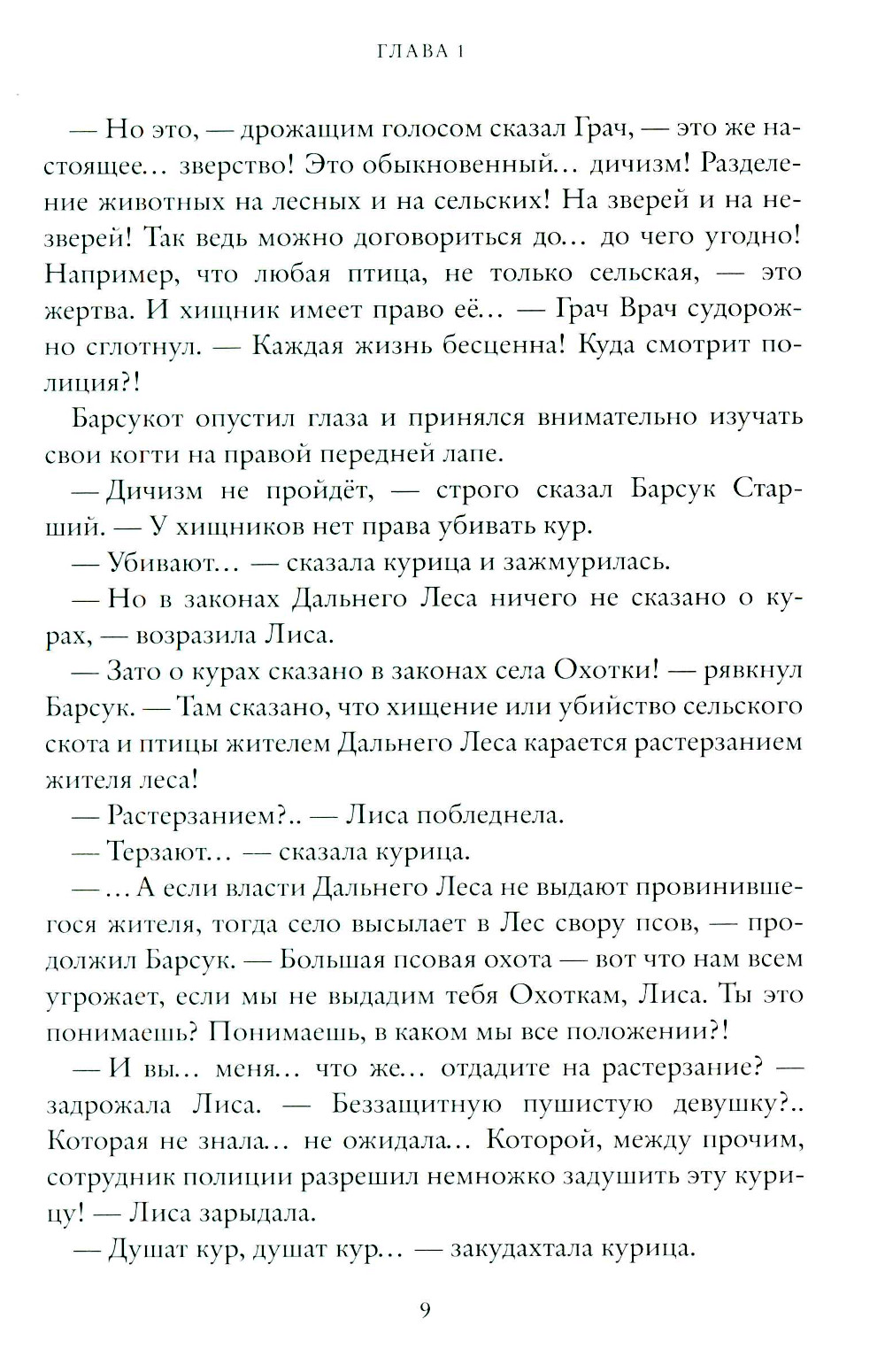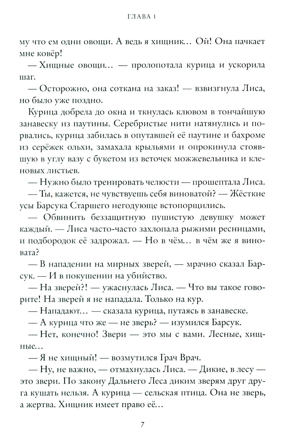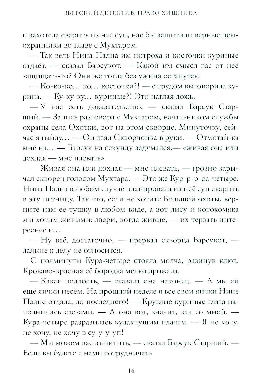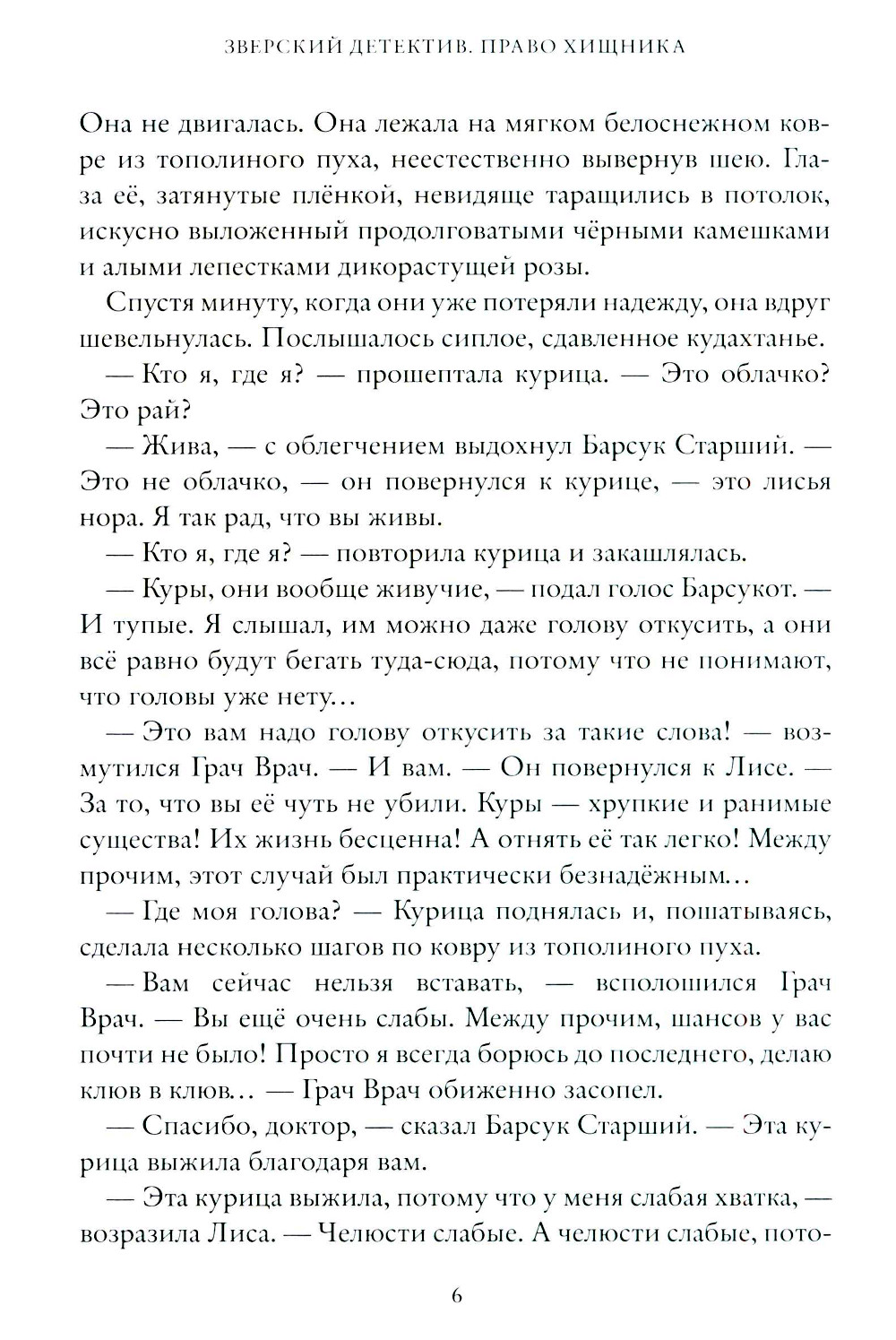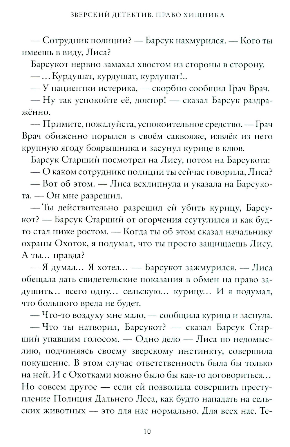 Над обитателями Дальнего Леса нависла страшная угроза. Совершено покушение на жизнь курицы, и виновник - здесь, среди лесных зверей! Начальник полиции Барсук Cтарший и его помощник Барсукот должны в короткое время найти убийцу и выдать его охотничьим псам, иначе весь Дальний Лес ожидает расправа! Смогут ли наши герои раскрыть преступление? Под чьей мягкой шубкой прячется настоящий зверь? Или теперь, когда законы нарушены, всё решает право хищника? «...Мутный, расплывчатый силуэт зверя во мгле... Он осторожно крадётся к курятнику, опустив голову и прижимаясь к земле... Повадки хищника. Повадки профессионального киллера. Вот он задирает свою хищную морду к полной луне... О, как знаком Барсуку полиции этот мечтательный взгляд на луну перед молниеносным броском - короткий магический ритуал, исполняемый ночью зверем-убийцей». «Право хищника» - вторая часть цикла «Зверский детектив» Анны Старобинец, в который входят также «Логово волка», «Когти гнева», «Щипач», «Боги манго» и «Хвостоеды».