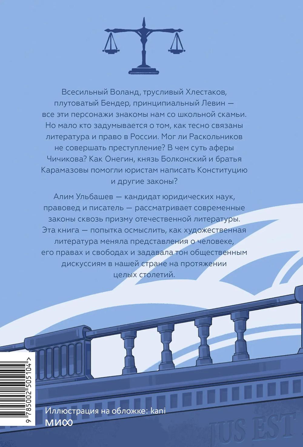 Всесильный Воланд, трусливый Хлестаков, плутоватый Бендер, принципиальный Левин - все эти персонажи знакомы нам со школьной скамьи. Но мало кто задумывается о том, как тесно связаны литература и право в России. Мог ли Раскольников не совершать преступление? В чем суть аферы Чичикова? Как Онегин, князь Болконский и братья Карамазовы помогли юристам написать Конституцию и другие законы? Автор Алим Ульбашев рассказывает о том, как правовая тематика проникала в русскую литературу и с какими сложностями сталкивалась на своем пути; рассматривает, какие аспекты гражданского и уголовного права встречаются в известных произведениях русской литературы XIX-XX вв., а также исследует, как литературные сюжеты меняли представления отечественных юристов и задавали тон общественным дискуссиям на протяжении целых столетий.| Издательство | Манн, Иванов и Фербер |