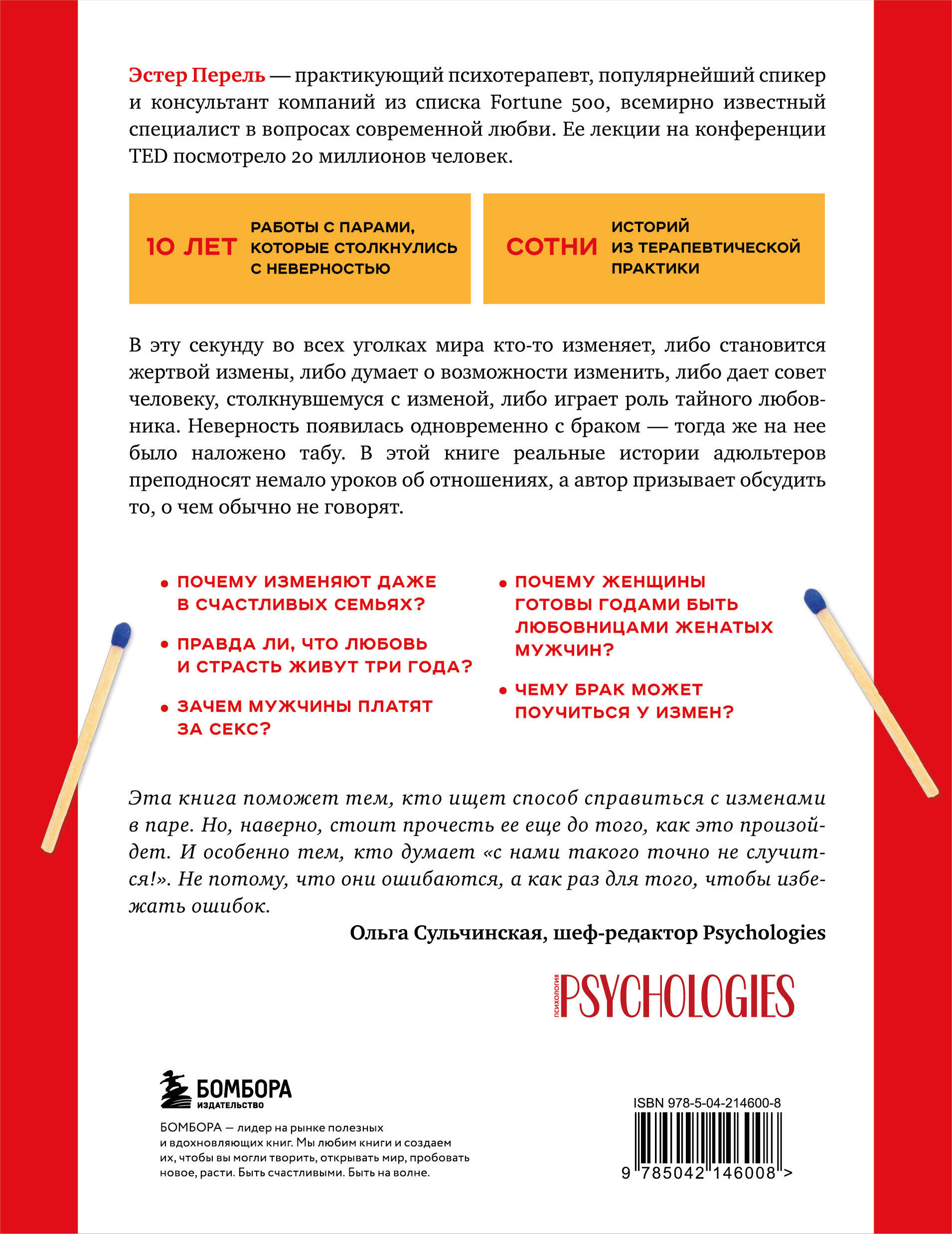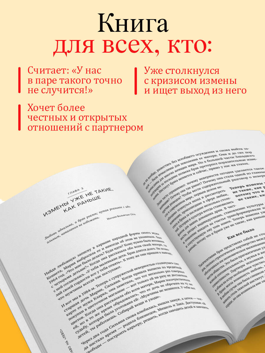 10 ЛЕТ РАБОТЫ С ПАРАМИ, КОТОРЫЕ СТОЛКНУЛИСЬ С НЕВЕРНОСТЬЮ. СОТНИ ИСТОРИЙ ИЗ ТЕРАПЕВТИЧЕСКОЙ ПРАКТИКИ. В эту секунду во всех уголках мира кто-то изменяет, либо становится жертвой измены, либо думает о возможности изменить, либо дает совет человеку, столкнувшемуся с изменой, либо играет роль тайного любовника. Неверность появилась одновременно с браком - тогда же на нее было наложено табу. В этой книге реальные истории адюльтеров, которые преподносят немало уроков об отношениях, призывают обсудить то, о чем обычно не говорят. - Почему изменяют даже в счастливых семьях? - Правда ли, что любовь и страсть живут три года? - Почему мужчины готовы платить за секс? - Почему женщины соглашаются годами быть тайными любовницами женатых мужчин? - Чему брак может научиться у неверности? Об авторе Эстер Перель - всемирно известный психотерапевт, популярнейший спикер и консультант компаний Nike, Johnson & Johnson. Ее лекции на TED посмотрело 18 миллионов человек. Эстер имеет 30-летний опыт терапевтической практики и работает в медицинском центре Нью-Йоркского университета и в Колумбийском университете, говорит на 8 языках. Из книги: «Деньги. Дети. ЗППП. Планирование. Беспечность. Стыд. Сомнения в себе. Слухи и суждения. Конкретный человек, время, место, социальный контекст. Если этот краткий сборник жутких историй любви что-то нам и показывает, так это то, что все измены похожи друг на друга, но восприятие каждой уникально. Нет смысла сводить измены к сексу и лжи, ведь в таком случае за кадром остается множество других деталей, определяющих нюансы пытки и намечающих пути к излечению». Отзывы «Речь пойдет не только об изменах. Еще о том, что мужское желание не менее прихотливо, чем женское. О связи сексуальности с агрессией. О фантазиях, которыми мы не рискуем поделиться с партнерами. А еще автор рассказывает множество историй из своей практики. Их участники имеют разный возраст, статус, образование и эротические пристрастия, а мы с их помощью сможем утолить любопытство относительно того, "как это у других", и заодно лучше понять себя. Эта книга поможет тем, кто ищет способ справиться с изменами в паре. Но, наверно, стоит прочесть ее еще до того, как это произойдет. И особенно тем, кто думает: "С нами такого точно не случится!" Не потому, что они ошибаются, а как раз для того, чтобы избежать ошибок». - Ольга Сульчинская, шеф-редактор Psychologies «Подозреваю, чьи-то розовые очки разобьются стеклами внутрь. Перель препарирует понятия верности, измены, брачных обязательств, вынуждая читателя задуматься о том, о чем, вероятно, он предпочел бы не думать. И это нормально, если после прочтения книги у вас появится еще больше вопросов, чем было до этого. В этом, пожалуй, и заключается главная, беспрецедентная ценность этой книги». - Арина Винтовкина, секс-эксперт, автор блога «Это нормально» «Измена меняет всё - или ничего не меняет? Существует ли измена вообще и что является ею? То, что тебе может быть хорошо не с одним человеком, или факт лжи о том, где ты был прошлой ночью? Почему мы вообще считаем, что право на тело (и распоряжение им) другого человека хоть сколько-нибудь нам принадлежит? Эта книга - исследование на тему, которую каждому из нас хотелось бы обойти, и ни у кого не вышло: рано или поздно все задают себе эти вопросы». - Радмила Хакова, автор книги «147 свиданий» «Эстер Перель разрушает на