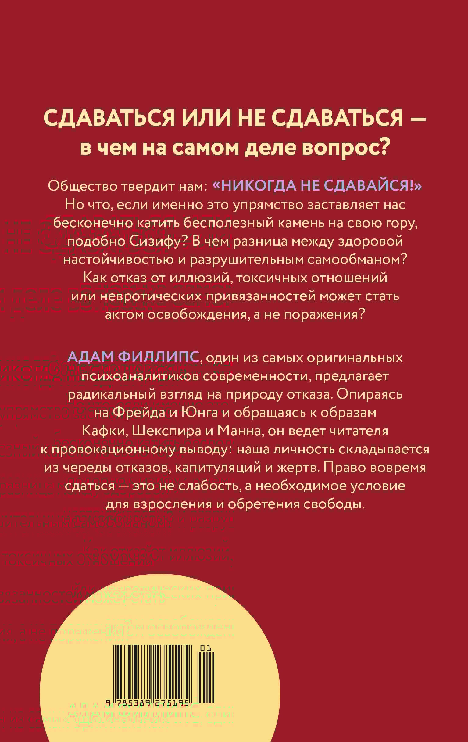 Сдаваться или не сдаваться - в чем на самом деле вопрос? Общество твердит нам: «Никогда не сдавайся!». Но что, если именно это упрямство заставляет нас бесконечно катить бесполезный камень на свою гору, подобно Сизифу? В чем разница между здоровой настойчивостью и разрушительным самообманом? Как отказ от иллюзий, токсичных отношений или невротических привязанностей может стать актом освобождения, а не поражения? Адам Филлипс, один из самых оригинальных психоаналитиков современности, предлагает радикальный взгляд на природу отказа. Опираясь на Фрейда и Юнга и обращаясь к образам Кафки, Шекспира и Манна, он ведет читателя к провокационному выводу: наша личность складывается из череды отказов, капитуляций и жертв. Право вовремя сдаться - это не слабость, а необходимое условие для взросления и обретения свободы.| Издательство | Издательство АЗБУКА ООО |