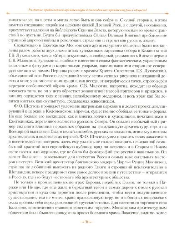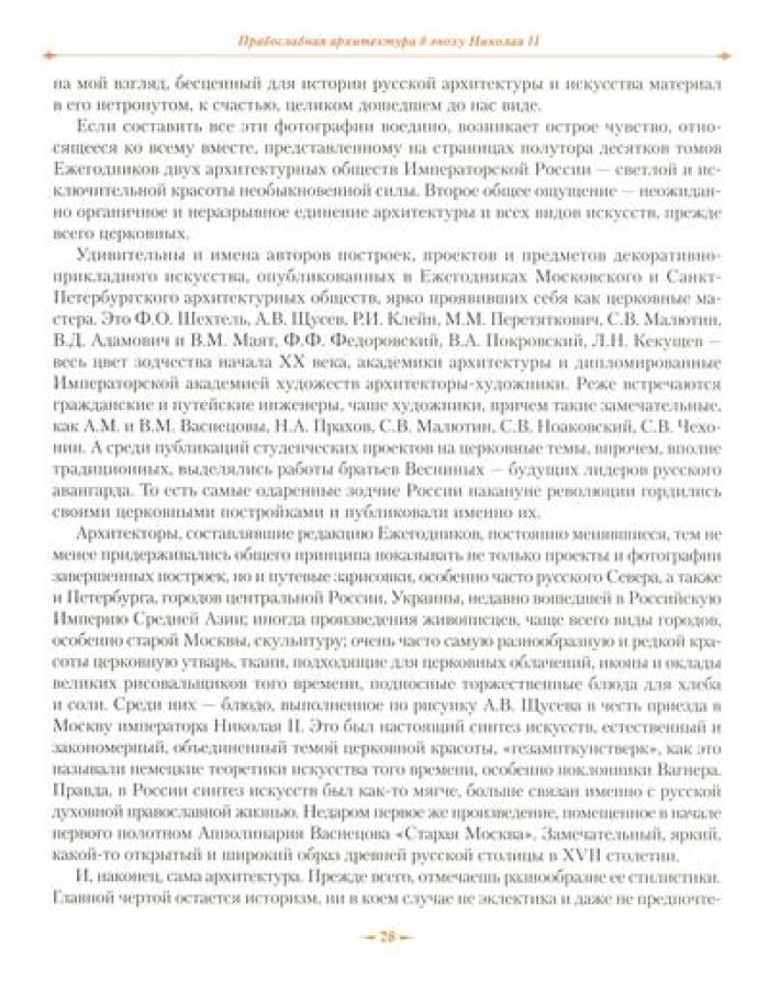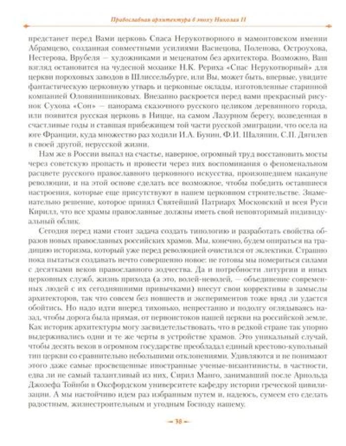 Книга посвящена русской православной архитектуре эпохи царствования императора Николая II, самого конца XIX и первых 17 лет XX века, когда, перед исчезновением почти на целое столетие, храмовое зодчество России переживало подлинный расцвет. Авторы ставили перед этим изданием задачу показать не се годняшние изображения, а возможно большее число подлинных фотографий с натуры, проектов и рисункое того времени, исполненных выдающимися мастерами церковных искусств, и предпослать им очерк истории архитектуры церквей времени царствования последнего императора. Этот том основывается на материалах отобранных редакциями Ежегодников Санкт-Петербургского и Московского архитектурных обществ в эпохСеребряного века российской культуры.Для архитекторов, художников, историков искусства и широкой публики, интересующейся зодчеством Русской Православной церкви.| Издательство | Архитектура-С |