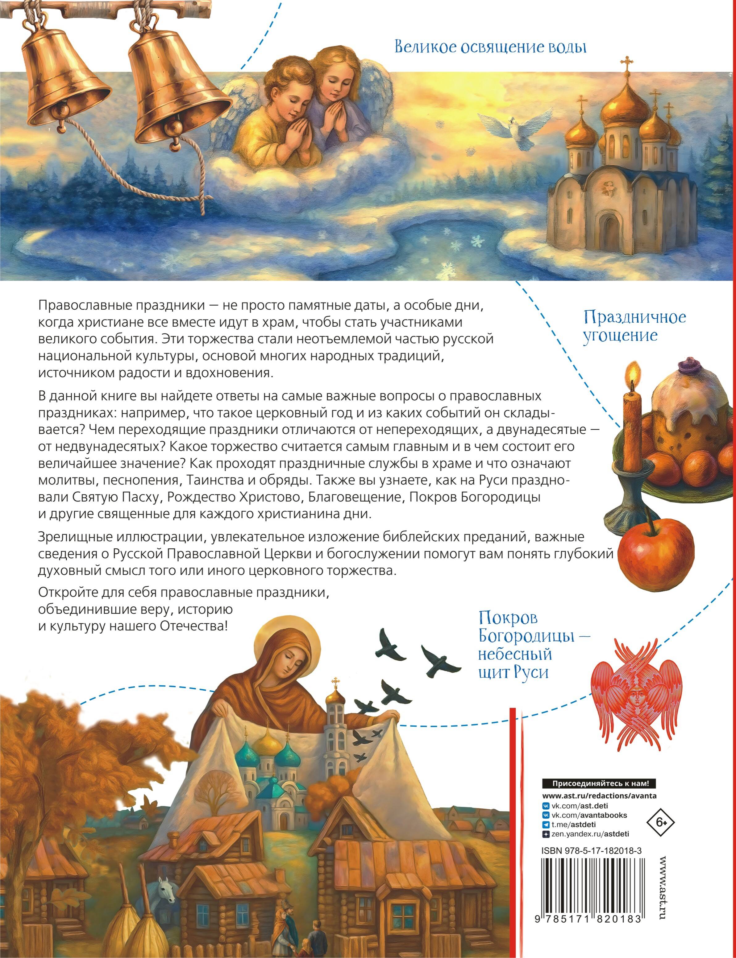 Знаете ли вы, для чего на Светлую Пасху мы красим яйца, а на Рождество Христово наряжаем елку, на КрещениеГосподне запасаемся святой крещенской водой, а на Яблочный Спас приносим в храм плоды нового урожая? В честь кого в церкви звучат красивые песнопения и почему священники надевают на богослужение облачения разногоцвета? Эта книга поможет вам найти ответы на такие и многие другие вопросы о православных праздниках. Здесь рассказывается о том, что такое церковный год и из каких событий он состоит, сколько самых почитаемых церковных праздников и какой из них считается главным, как проходит торжественная служба в храме и что означают молитвы, Таинства и обряды. Также вы узнаете, как на Руси праздновали Благовещение и Вербное воскресенье, Пасху Христову и День Святой Троицы, Покров Богородицы и другие важные для каждого христианина дни, какие соблюдали традиции, какие пели песни и проводили игры, какие готовили угощения и подарки. Зрелищные иллюстрации, увлекательное повествование, простые объяснения и любопытные факты помогут вам понять глубокий духовный смысл того или иного православного праздника и почувствовать себя частью великой истории и культуры русского народа. Для среднего школьного возраста.| Издательство | Издательство "АСТ" |