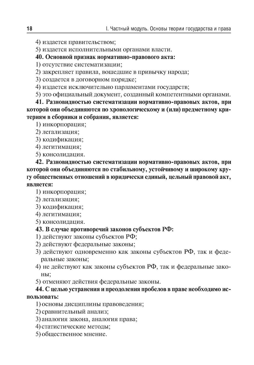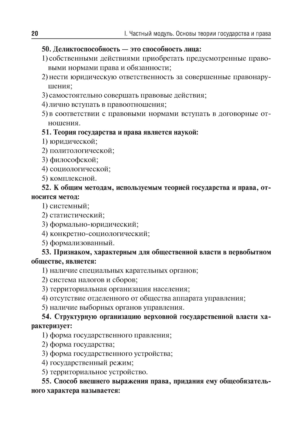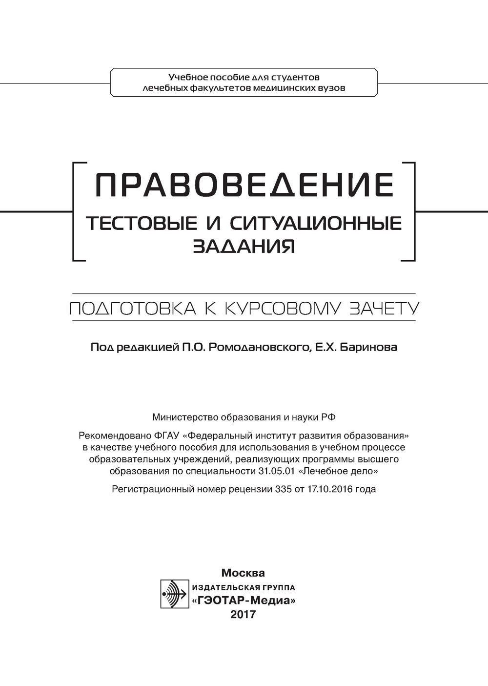 Данное учебное пособие содержит большое количество тестовых и ситуационных заданий по курсу «Правоведение», полностью охватывающих все разделы изучаемой дисциплины. Для обеспечения эффективности самостоятельной работы студентов в пособии даны ориентировочные основы действия и представлены подробные схемы, которыми они могут руководствоваться при выполнении того или иного задания. Учебное пособие предназначено для студентов лечебных факультетов медицинских высших учебных заведений в целях внеаудиторной работы и помощи в подготовке к курсовому зачету.| Издательство | ГЭОТАР-Медиа |