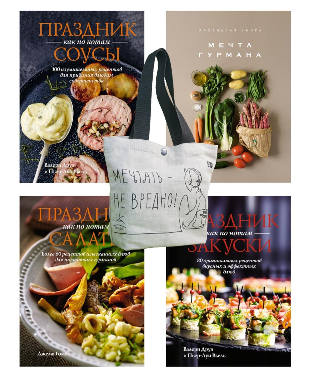 В комплекте 4 книги в мини-формате с подробными рецептами и яркими фотографиями, которые сделают процесс готовки простым и увлекательным. Что входит в комплект? 1. «Маленькая книга. Мечта гурмана». Погрузитесь в мир гастрономических шедевров разных стран мира: от Европы до Востока. 2. «Праздник как по нотам. Салаты» Создавайте идеальные праздничные столы с легкими и изысканными салатами французской кухни. Эти блюда станут ярким акцентом вашего праздника. 3. «Закуски: 80 оригинальных рецептов вкусных и эффектных блюд» Добавьте яркости вашему столу с помощью креативных закусок. От простых до сложных, они украсят любой ужин и порадуют ваших гостей. 4. «Соусы: 100 изумительных рецептов для придания блюдам совершенства» Узнайте секреты приготовления соусов, которые подчеркнут вкус любых блюд. От классики до новаторских идей - каждый соус подарит вашим блюдам новый оттенок вкуса. Дополнительный бонус - маленький шоппер «Мечтать не вредно!» с кнопкой. Экологичная и стильная сумка из льна станет прекрасным дополнением к вашему подарочному набору. Компактный размер делает шоппер универсальным аксессуаром для различных целей, будь то ношение книг с собой, упаковывка подарка или хранение личных вещей. С набором книг «Праздник мечты: изысканные рецепты» вы научитесь готовить блюда разной сложности, от греческого салата и классического песто до киша с брокколи и тарт татена, в считаные минуты! Набор может стать оригинальным презентом на Новый год, день рождения, 14 февраля, 8 марта и другие праздники. Подойдет в качестве подарка мужчине и женщине, коллеге, парню и девушке, маме и папе, любимому человеку, брату и сестре, другу и подруге. Создайте атмосферу праздника дома с нашими изысканными рецептами!