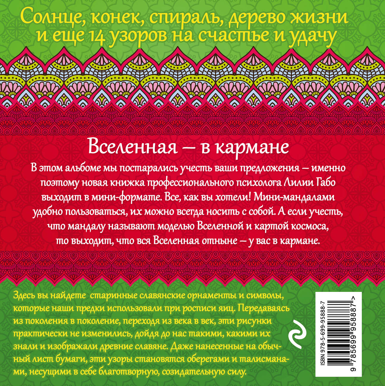 В этом альбоме вы найдете старинные славянские орнаменты и символы, которые наши предки использовали при росписи яиц. Передаваясь из поколения в поколение, переходя из века в век, эти рисунки практически не изменились, дойдя до нас такими, какими их знали и изображали древние славяне. Даже нанесенные на обычный лист бумаги, эти узоры становятся оберегами и талисманами, несущими в себе благотворную, созидательную силу. Раскрашивая их, можно приобщиться к знаниям и верованиям предков, настроить сердце на светлый и радостный лад, написать на яйце свое послание-просьбу Вселенной и приблизить исполнение самых заветных желаний.