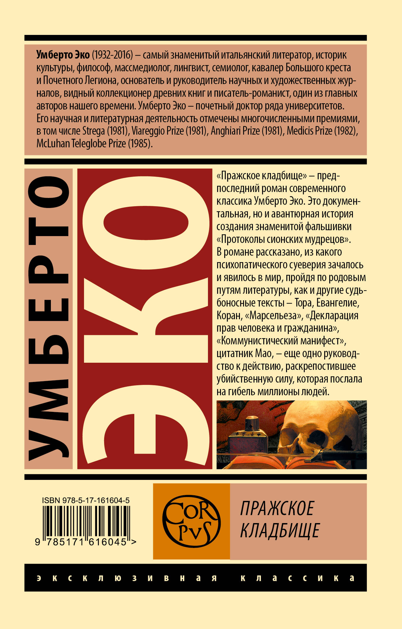 Действие романа "Пражское кладбище" разворачивается почти целиком во Франции, но последствия этой интриги трагически поразят потом целый мир. В центре событий довольно скоро окажется Россия, где в 1905 году была впервые напечатана знаменитая литературная подделка "Протоколы сионских мудрецов". В романе документально рассказано, чьими усилиями эта подделка была создана. Главный герой очень гадок, а все, что происходит с ним, и ужасно, и интересно. Автор, строя сюжет в духе Александра Дюма, протаскивает затаившего дыхание читателя по зловонным парижским клоакам и по бандитским притонам, вербует героя в гарибальдийское войско, заставляет его шпионить на все разведки и контрразведки мира, в том числе и на русскую охранку, укрощать истеричек из клиники доктора Шарко, распивать пиво с Зигмундом Фрейдом, форсить бок о бок со Свободой на баррикадах и даже участвовать в сатанинской мессе. Одновременно, как всегда, Умберто Эко выдает читателю в оболочке приключенческого романа огромный заряд знаний и идей.| Издательство | Издательство "АСТ" |