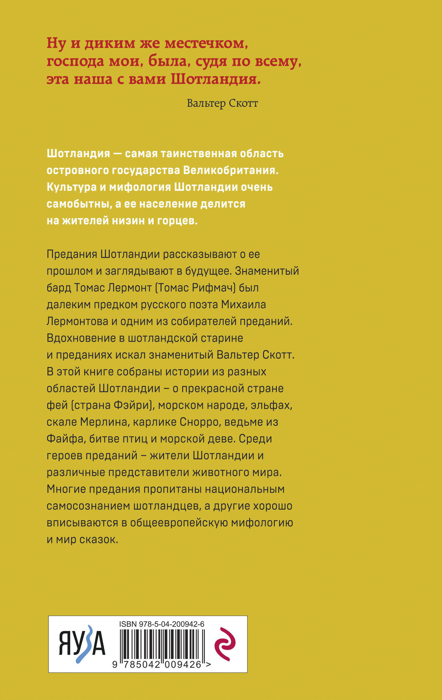 Шотландия - самая таинственная область островного государства Великобритания. Культура и мифология Шотландии очень самобытна, а ее население делится на жителей низин и горцев. Предания Шотландии рассказывают о ее прошлом и заглядывают в будущее. Знаменитый бард Томас Лермонт (Томас Рифмач) был далеким предком русского поэта Михаила Лермонтова и одним из собирателей преданий. Вдохновение в шотландской старине и преданиях искал знаменитый Вальтер Скотт. В этой книге собраны истории из разных областей Шотландии о прекрасной стране фей (страна Фэйри), морском народе, эльфах, скале Мерлина, карлике Снорро, ведьме из Файфа, битве птиц и морской деве. Среди героев преданий жители Шотландии и различные представители животного мира острова. Многие предания пропитаны национальным самосознанием шотландцев, а другие хорошо вписываются в общеевропейскую мифологию и мир сказок. ___________________________________________________________ «Ну и диким же местечком, господа мои, была, судя по всему, эта наша с вами Шотландия». - Вальтер Скотт