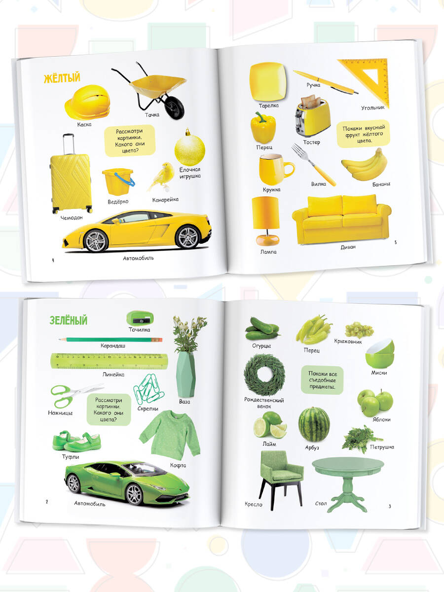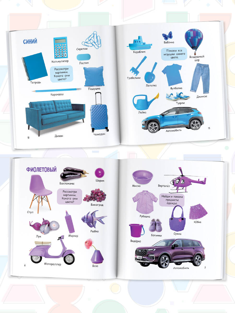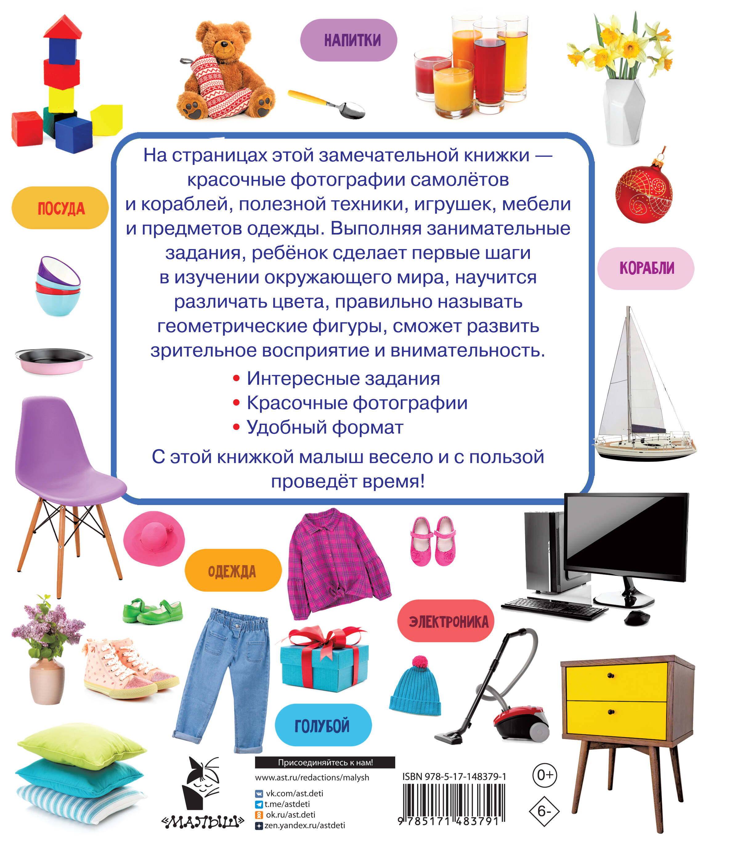 О чём эта книга «Предметы, цвета и формы» - это книжка с увлекательными заданиями для малышей. Рассматривая фотоизображения предметов домашнего обихода, игрушек и животных, дети будут изучать цвета и формы, знакомиться с окружающим миром.
