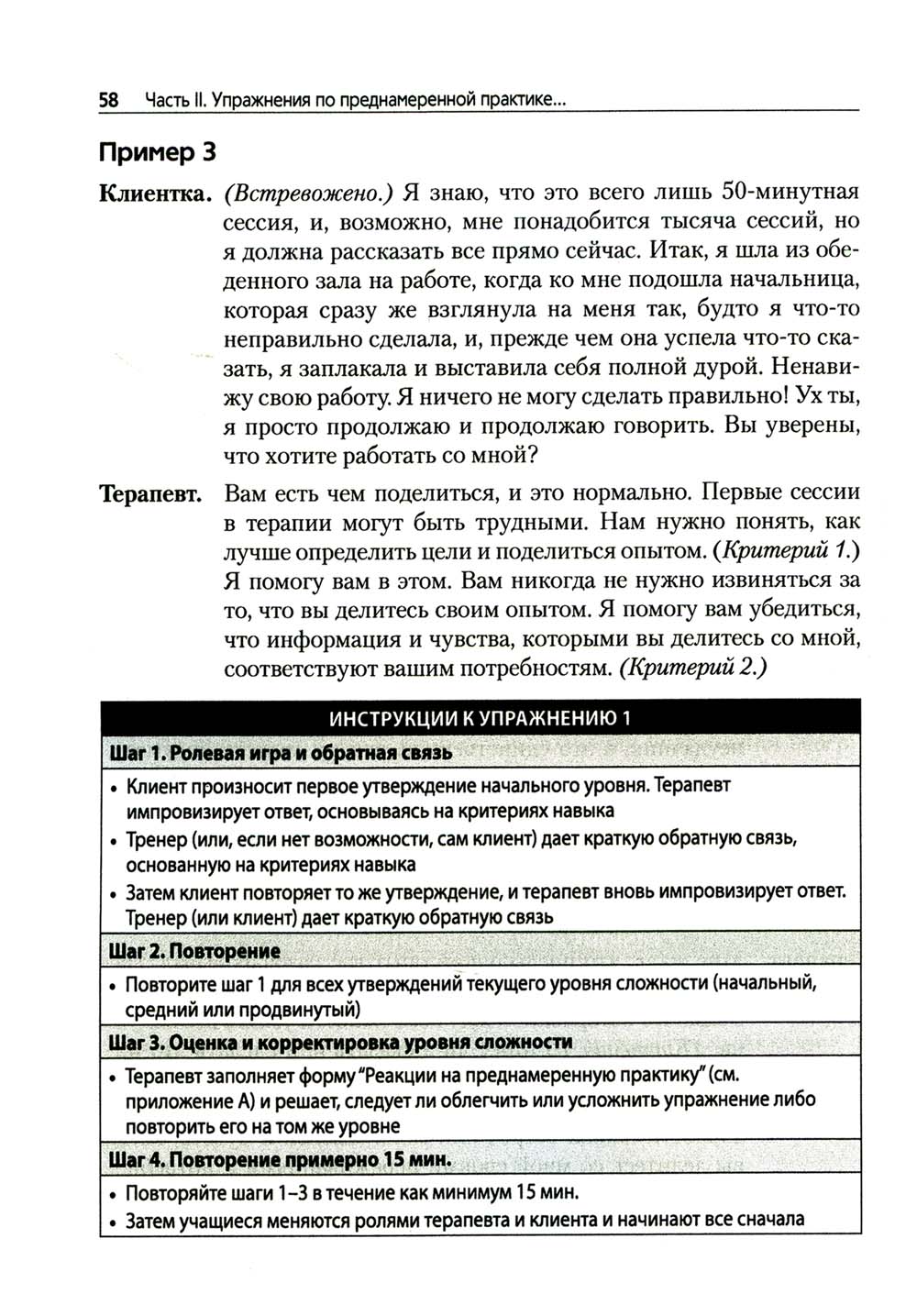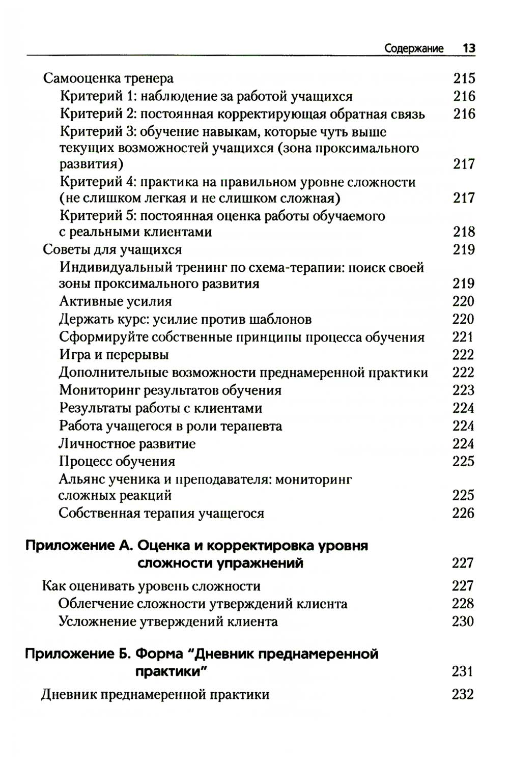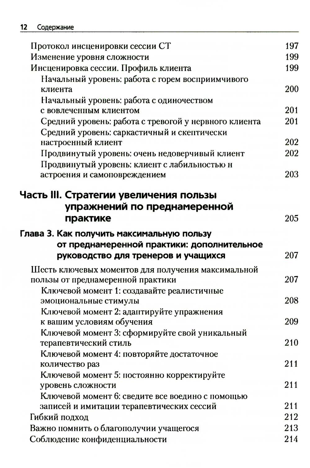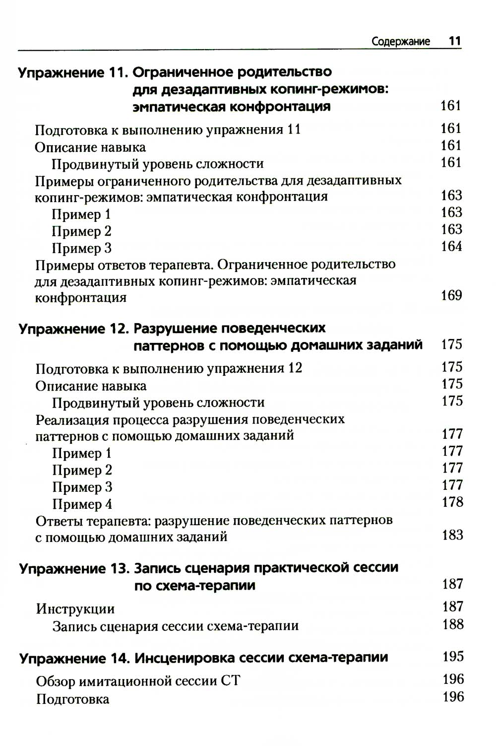 Эта книга содержит описание индивидуальных ролевых игр, в которых двое учащихся выступают в роли клиента и терапевта, сменяя друг друга под руководством супервизора. Практикующий в роли терапевта импровизирует соответствующие и аутентичные ответы на утверждения клиента, отнесенные к трем уровням сложности: начальному, среднему и продвинутому. Сам процесс отражает общие проблемы, с которыми сталкиваются схема-терапевты. Первые 12 упражнений посвящены навыкам, вытекающим из трех этапов схема-терапии (привязанности и эмоциональной регуляции, изменения режима и автономии), и включают в себя ограниченное родительство, психообразование схемному подходу и копинг-режимам и эмпатическую конфронтацию. После этого следуют два комплексных упражнения - аннотированный сценарий и имитация терапевтических сессий в свободной форме, - в которых практикующие интегрируют основные навыки в одну сессию. Пошаговые инструкции проводят обучающихся через упражнения, определяют критерии овладения каждым навыком и объясняют, как контролировать и корректировать терапевтический процесс. Также даны рекомендации, которые помогут инструкторам и ученикам получить максимальную отдачу от занятий. ОСНОВНЫЕ ТЕМЫ КНИГИ: - Теоретическая информация о схемном подходе и копинг-режимах; - Инструкции по преднамеренной практике; - Детальное описание упражнений; - Ролевые игры с режимами, диалоги режимов; - Аннотированный сценарий сессии схема-терапии; - Инсценировка сессии схема-терапии; - Приложения с формами и таблицами.