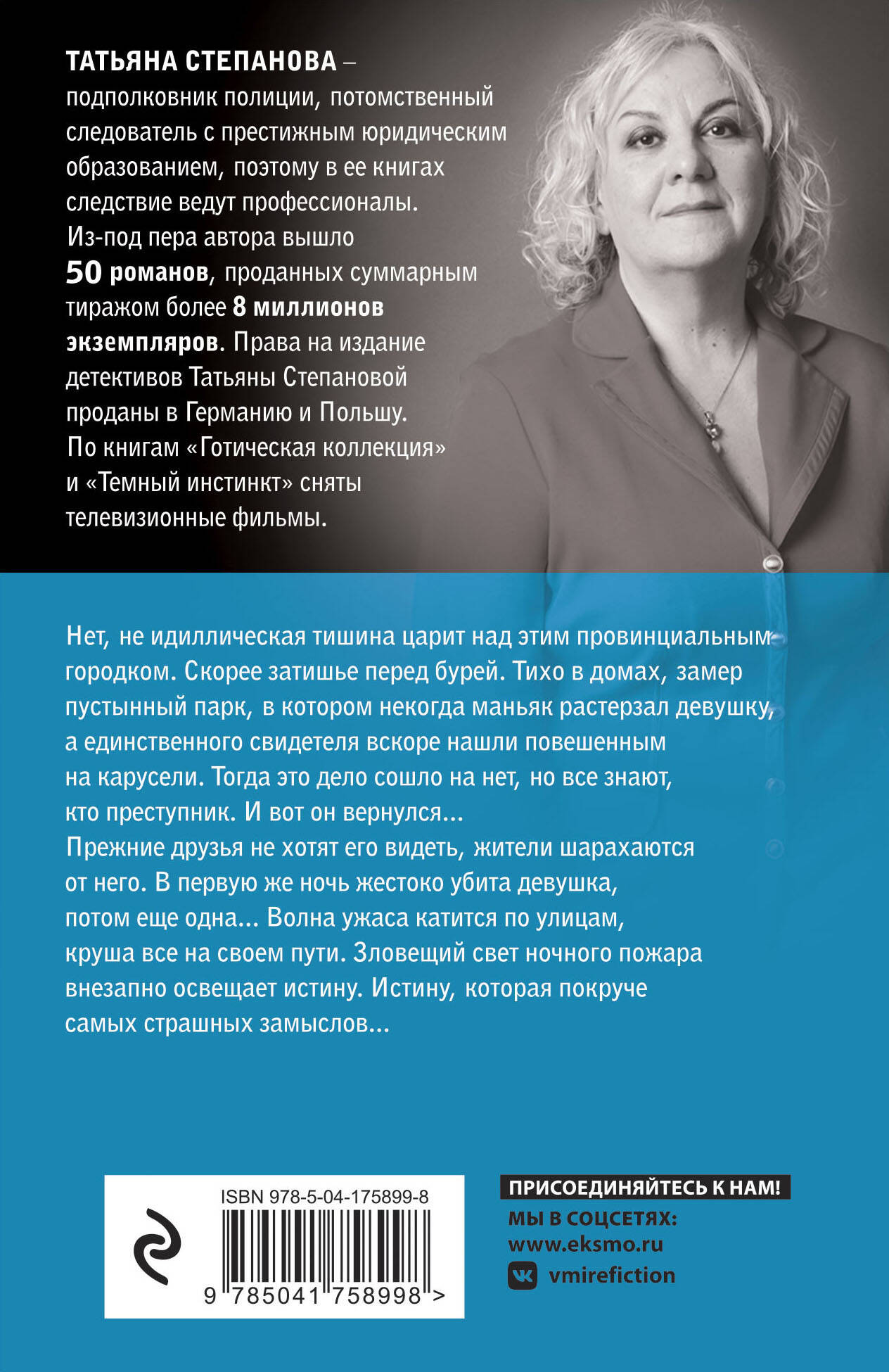 Нет, не идиллическая тишина царит над этим провинциальным городком. Скорее, затишье перед бурей. Тихо в домах, замер пустынный парк, в котором некогда маньяк растерзал девушку, а единственного свидетеля вскоре нашли повешенным на карусели. Тогда это дело сошло на нет, но все знают, кто преступник. И вот он вернулся... Прежние друзья не хотят его видеть, жители шарахаются от него. В первую же ночь жестоко убита девушка, потом еще одна... Волна ужаса катится по улицам, круша все на своем пути. Зловещий свет ночного пожара внезапно освещает истину. Истину, которая покруче самых страшных замыслов... Романы потомственного следователя Татьяны Степановой позволяют читателю побывать в литературной «комнате страха». Таинственные убийства, почти осязаемая атмосфера преступления, томительное и тревожное ожидание чего-то неведомого, пугающего... Все это Татьяне Степановой удается воспроизвести просто блестяще. Случайные встречи, повседневные дела, незначительные детали изображаются в ее детективах в каком-то особом, драматическом свете, словно безобидный весенний луг перед стремительно надвигающейся грозой.
