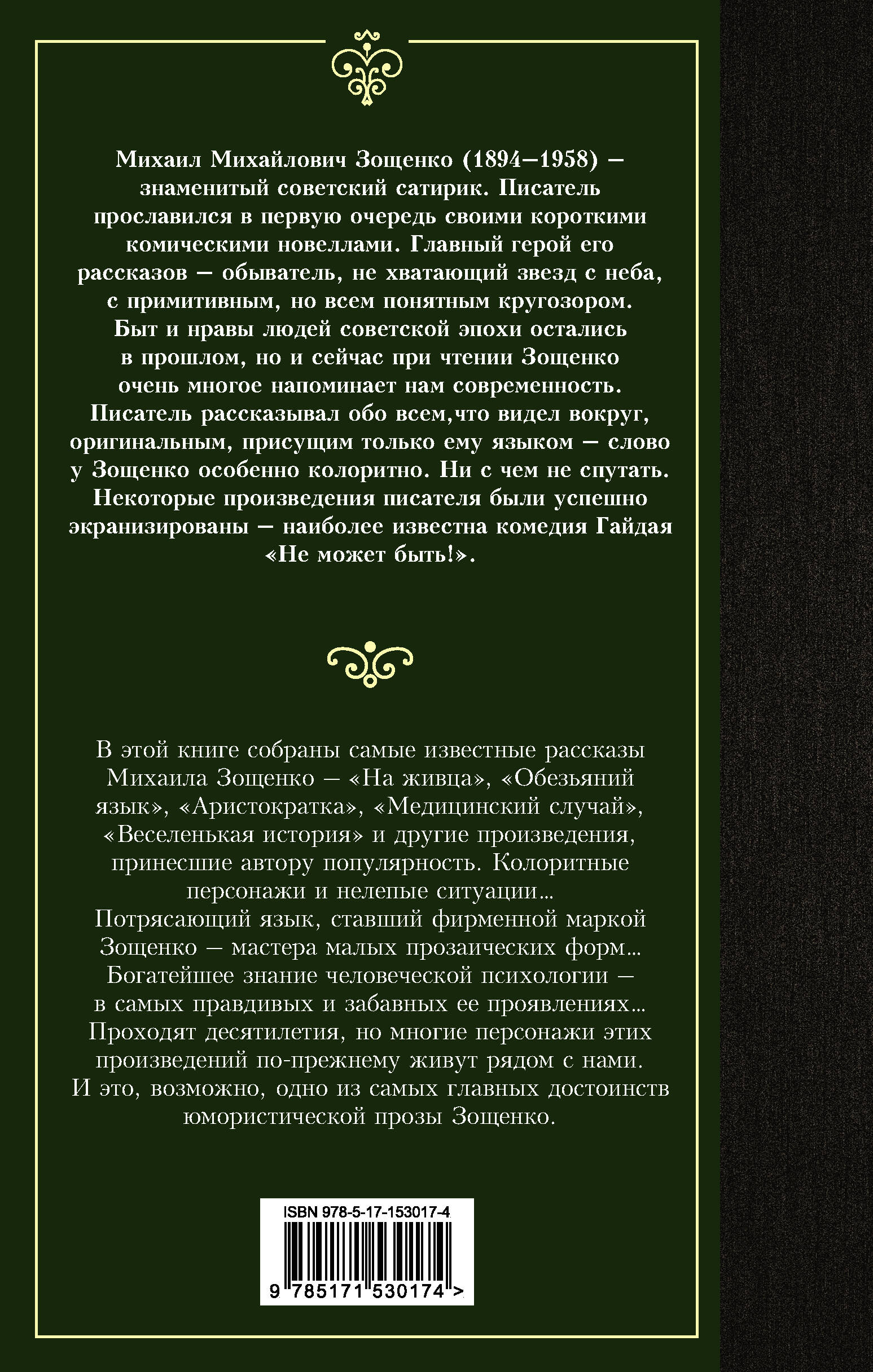 В этой книге собраны самые известные рассказы Михаила Зощенко - "На живца", "Обезьяний язык", "Аристократка", "Медицинский случай", "Веселенькая история" и другие произведения, принесшие автору популярность. Колоритные персонажи и нелепые ситуации… Потрясающий язык, ставший фирменной маркой Зощенко - мастера малых прозаических форм… Богатейшее знание человеческой психологии - в самых правдивых и забавных ее проявлениях… Проходят десятилетия - но многие персонажи этих произведений по прежнему живут рядом с нами. И это, возможно, одно из самых главных достоинств юмористической прозы Зощенко.| Издательство | ИЗДАТЕЛЬСТВО "АСТ" |