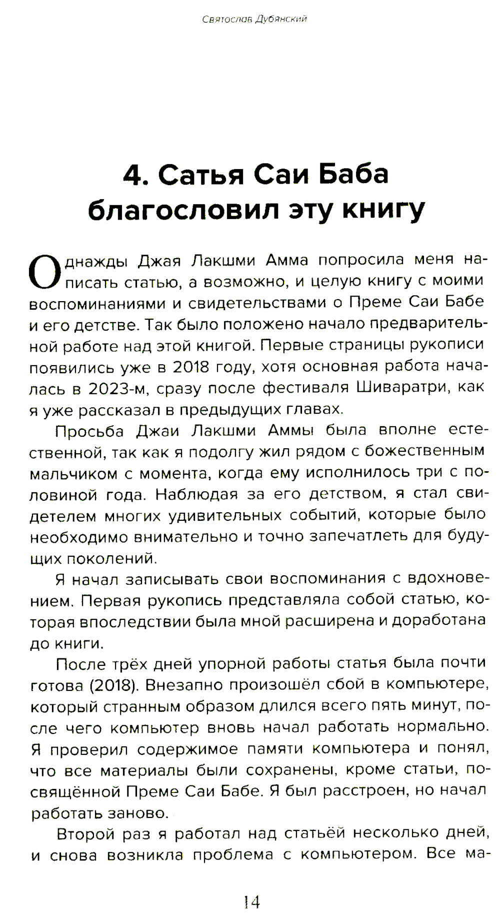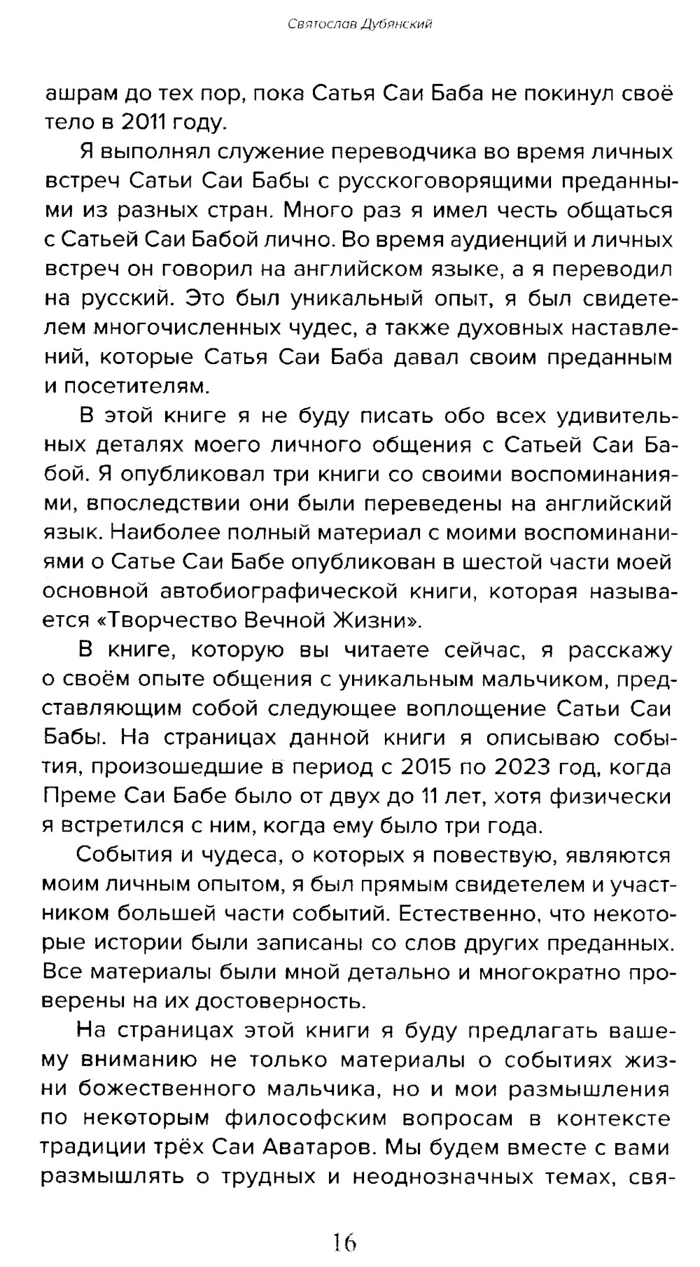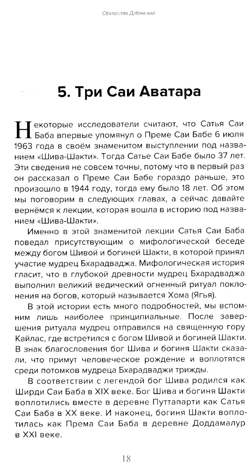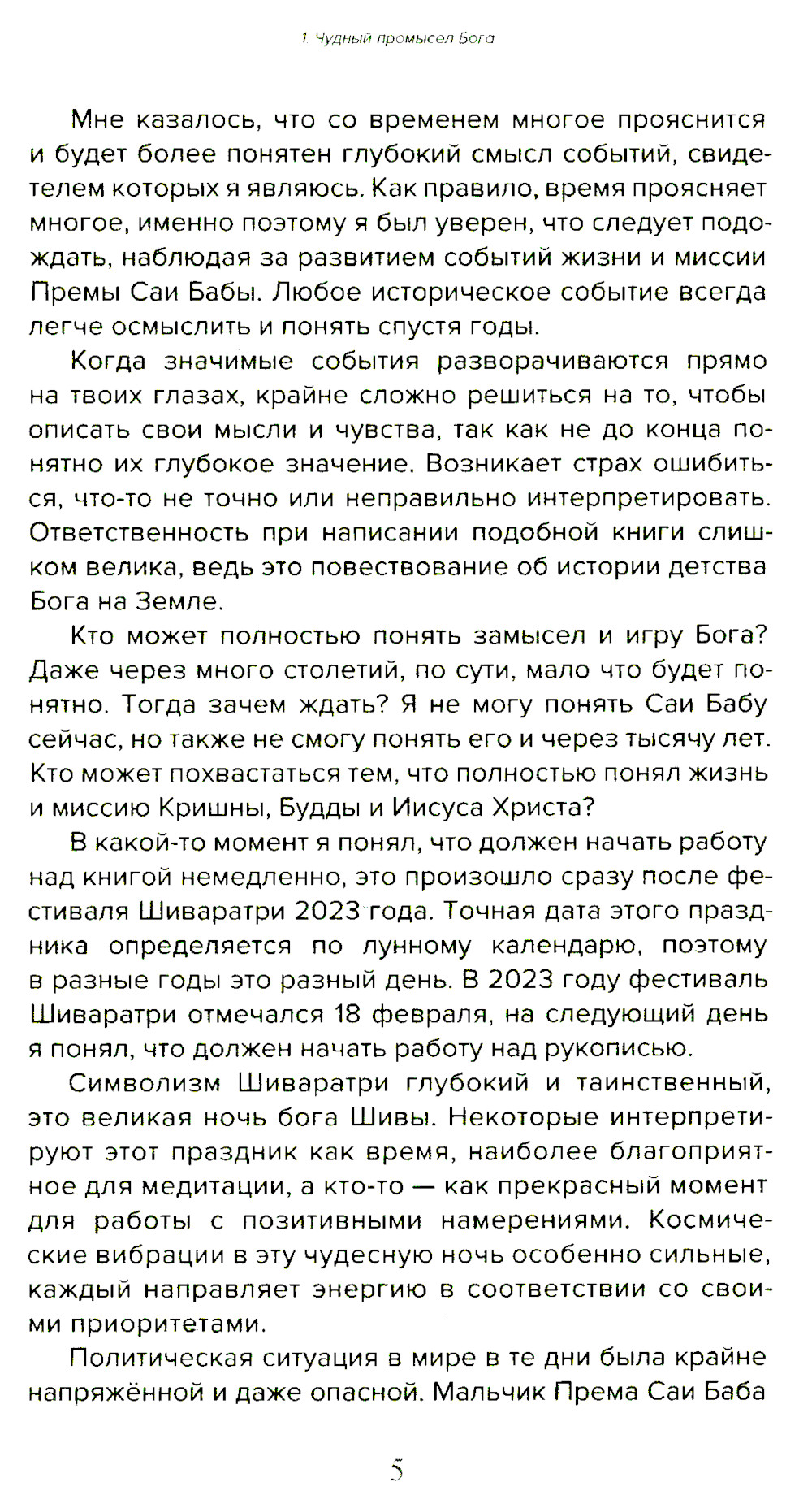 Эта книга посвящена Преме Саи Бабе, божественному воплощению XXI века. Према Саи Баба является третьим воплощением Бога на Земле в нашу эпоху. Первым был Ширди Саи Баба (1835-1918), вторым - Сатья Саи Баба (1926-2011). В самом начале я должен признать всю сложность написания этой книги именно в данный момент. Сейчас 2023 год, предыдущее воплощение Бога, Сатья Саи Баба, покинул физическое тело в 2011 году, то есть 12 лет тому назад. Према Саи Баба родился 28 июня 2012 года, на момент написания этой книги Преме Саи 11 лет. Первый раз я встретился с божественным ребёнком, когда ему было три года. Я посещаю его дом на протяжении восьми лет, наблюдая за каждым днём его детства, ростом и становлением.| Издательство | Книга |